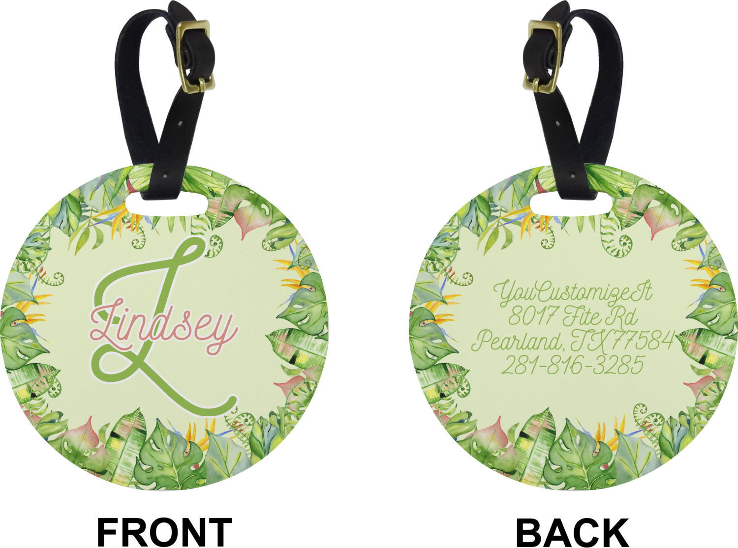 These personalized bag tags are sold in a variety of shapes, so that you may find the product that meets your vision exactly. We sell a round luggage tag, which measures at approximately 4" x 4". Our square luggage tag is about 3.5" x 3.5", while our rectangular version is 2.75" x 4 ".