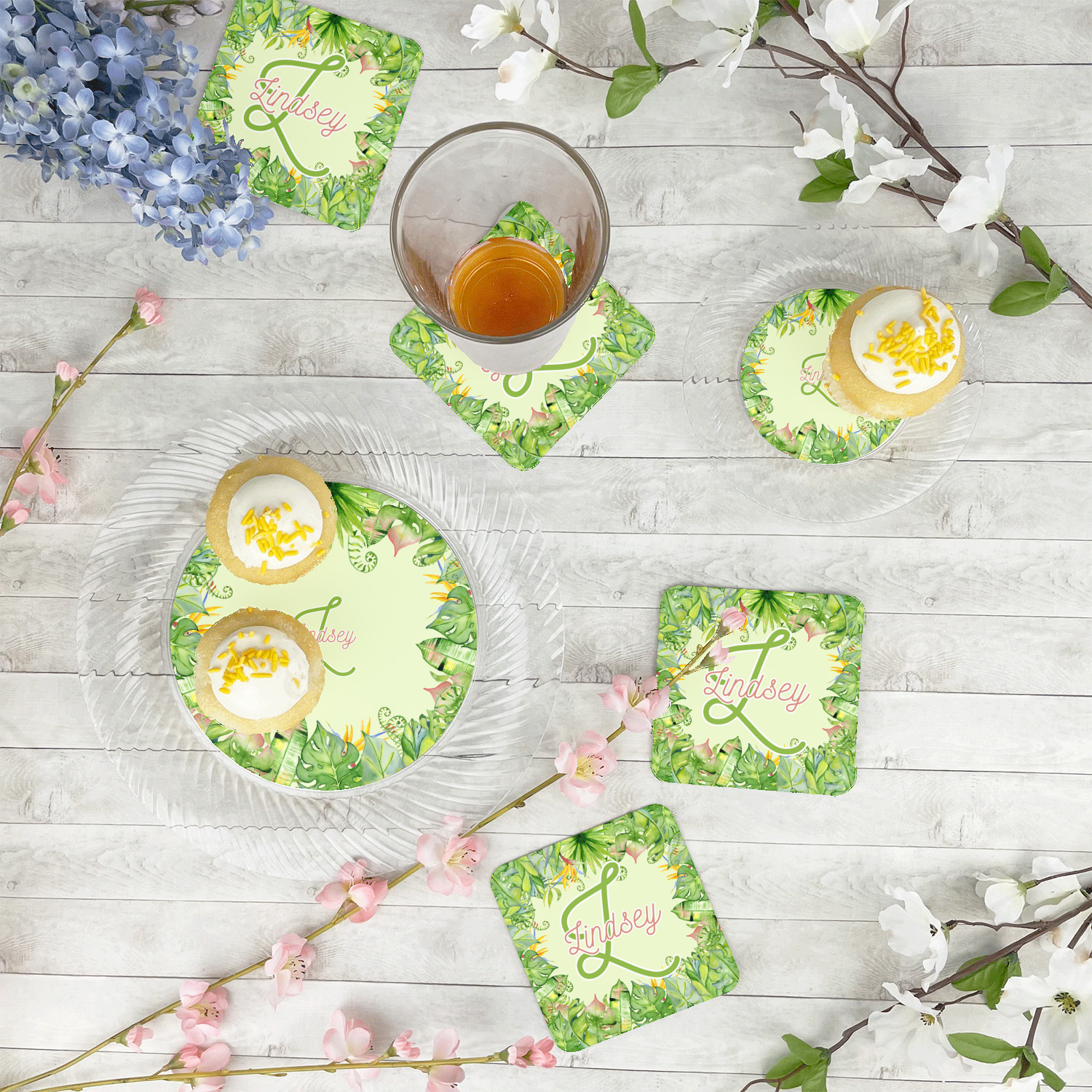 This design has a calming light green background. The foreground is filled with pops of dark green, lime, yellow, and a soft red. The tropical leaves really pop out at you as if they were real. The leaves are in a border or frame sort of formation surrounding a name and initial. This is a gorgeous design that looks a little bit different on each product it is on.