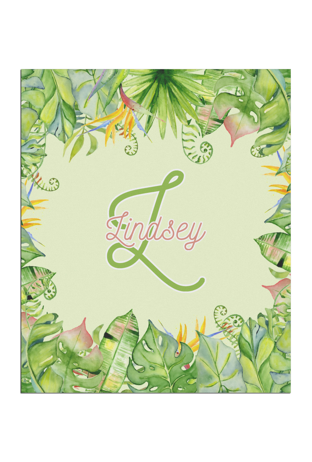 This design has a calming light green background. The foreground is filled with pops of dark green, lime, yellow, and a soft red. The tropical leaves really pop out at you as if they were real. The leaves are in a border or frame sort of formation surrounding a name and initial. This is a gorgeous design that looks a little bit different on each product it is on.