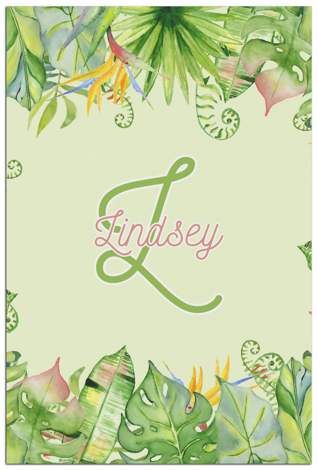 This design has a calming light green background. The foreground is filled with pops of dark green, lime, yellow, and a soft red. The tropical leaves really pop out at you as if they were real. The leaves are in a border or frame sort of formation surrounding a name and initial. This is a gorgeous design that looks a little bit different on each product it is on.