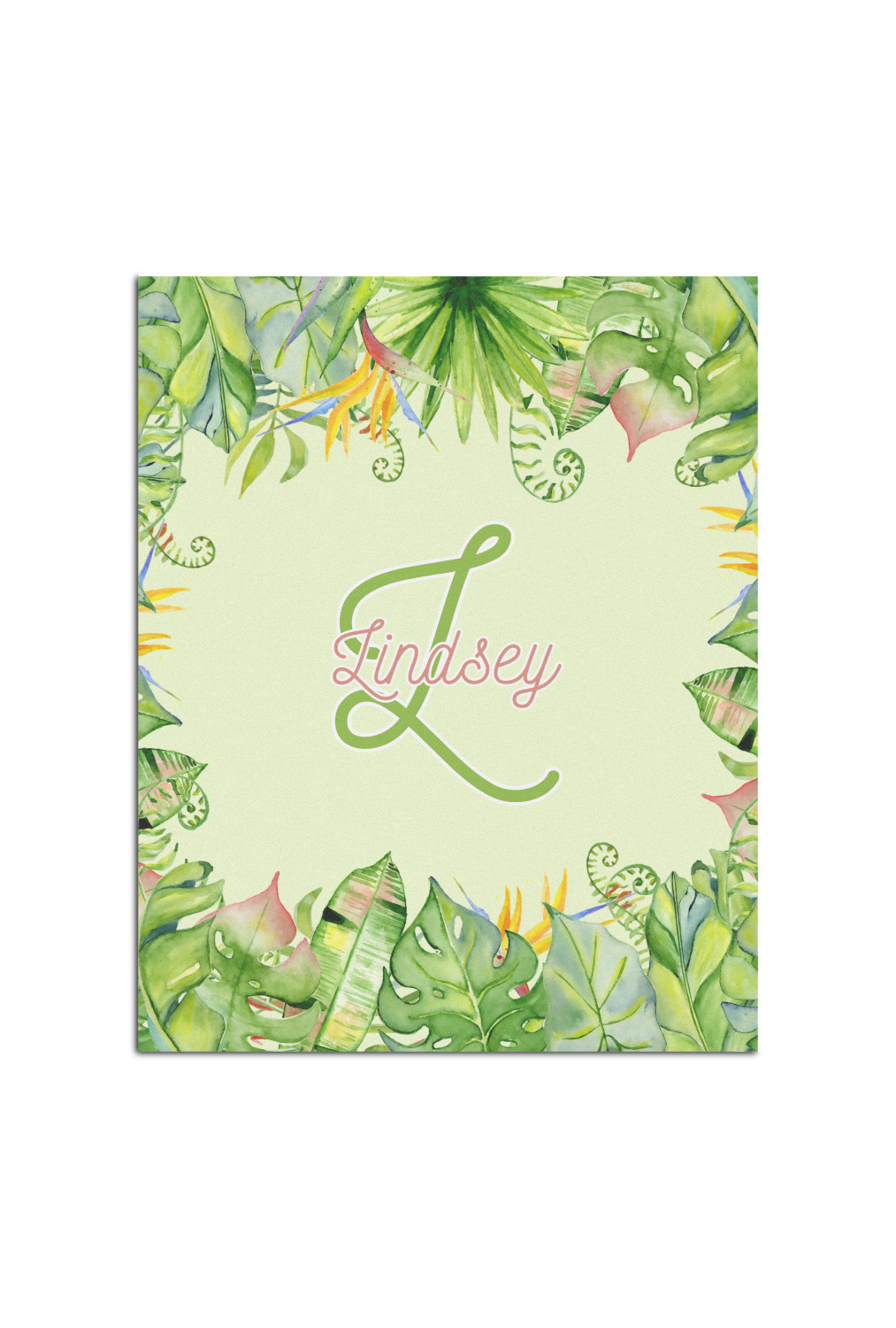 This design has a calming light green background. The foreground is filled with pops of dark green, lime, yellow, and a soft red. The tropical leaves really pop out at you as if they were real. The leaves are in a border or frame sort of formation surrounding a name and initial. This is a gorgeous design that looks a little bit different on each product it is on.
