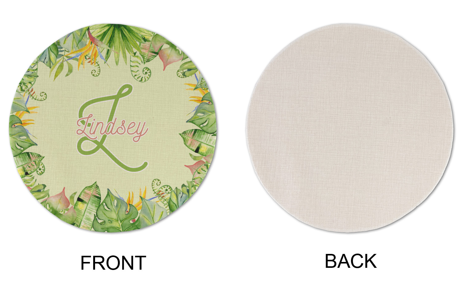 This design has a calming light green background. The foreground is filled with pops of dark green, lime, yellow, and a soft red. The tropical leaves really pop out at you as if they were real. The leaves are in a border or frame sort of formation surrounding a name and initial. This is a gorgeous design that looks a little bit different on each product it is on.