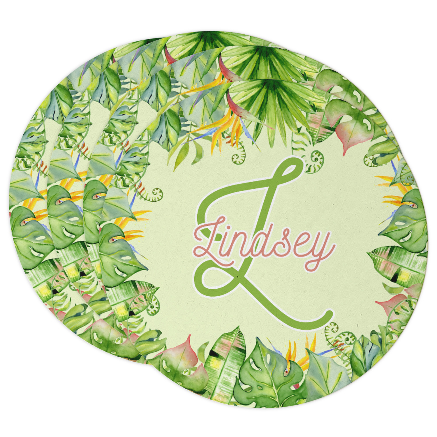 This design has a calming light green background. The foreground is filled with pops of dark green, lime, yellow, and a soft red. The tropical leaves really pop out at you as if they were real. The leaves are in a border or frame sort of formation surrounding a name and initial. This is a gorgeous design that looks a little bit different on each product it is on.