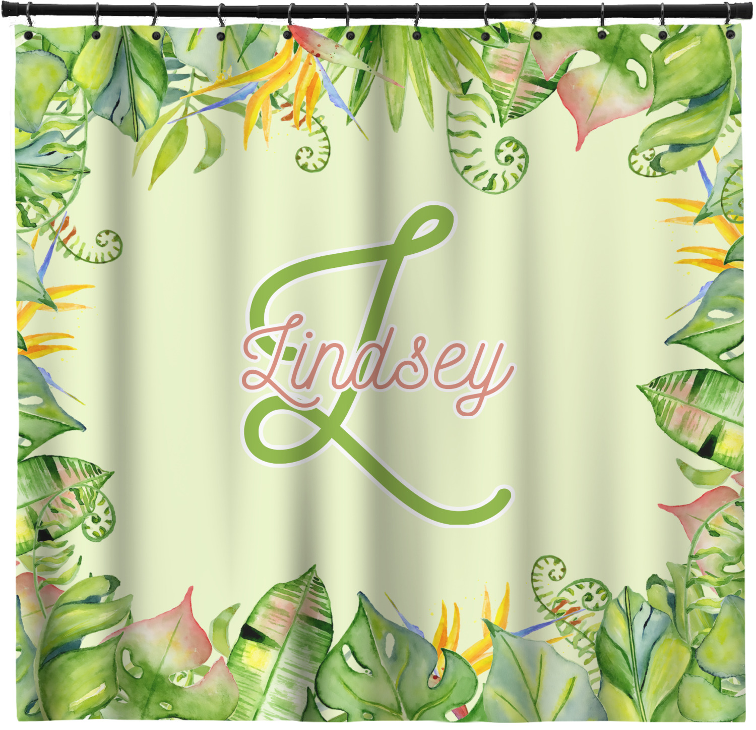 This design has a calming light green background. The foreground is filled with pops of dark green, lime, yellow, and a soft red. The tropical leaves really pop out at you as if they were real. The leaves are in a border or frame sort of formation surrounding a name and initial. This is a gorgeous design that looks a little bit different on each product it is on.