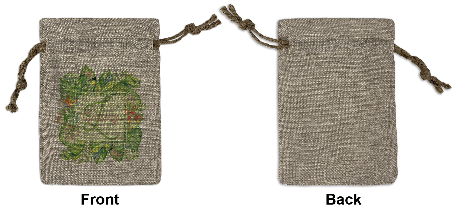 We sell our Burlap Gift Bags in 3 variant sized bags. Made with burlap polyester, each personalized bag can be secured with a twine drawstring pull. Your custom design is available to print on one side or both sides - completely up to you! The sizes of the bags measure approximately 4.5" x 6.5" for the smallest size, 6.5" x 8.0" for the medium size, and 6.5" x 13.5" for the large-sized bag.