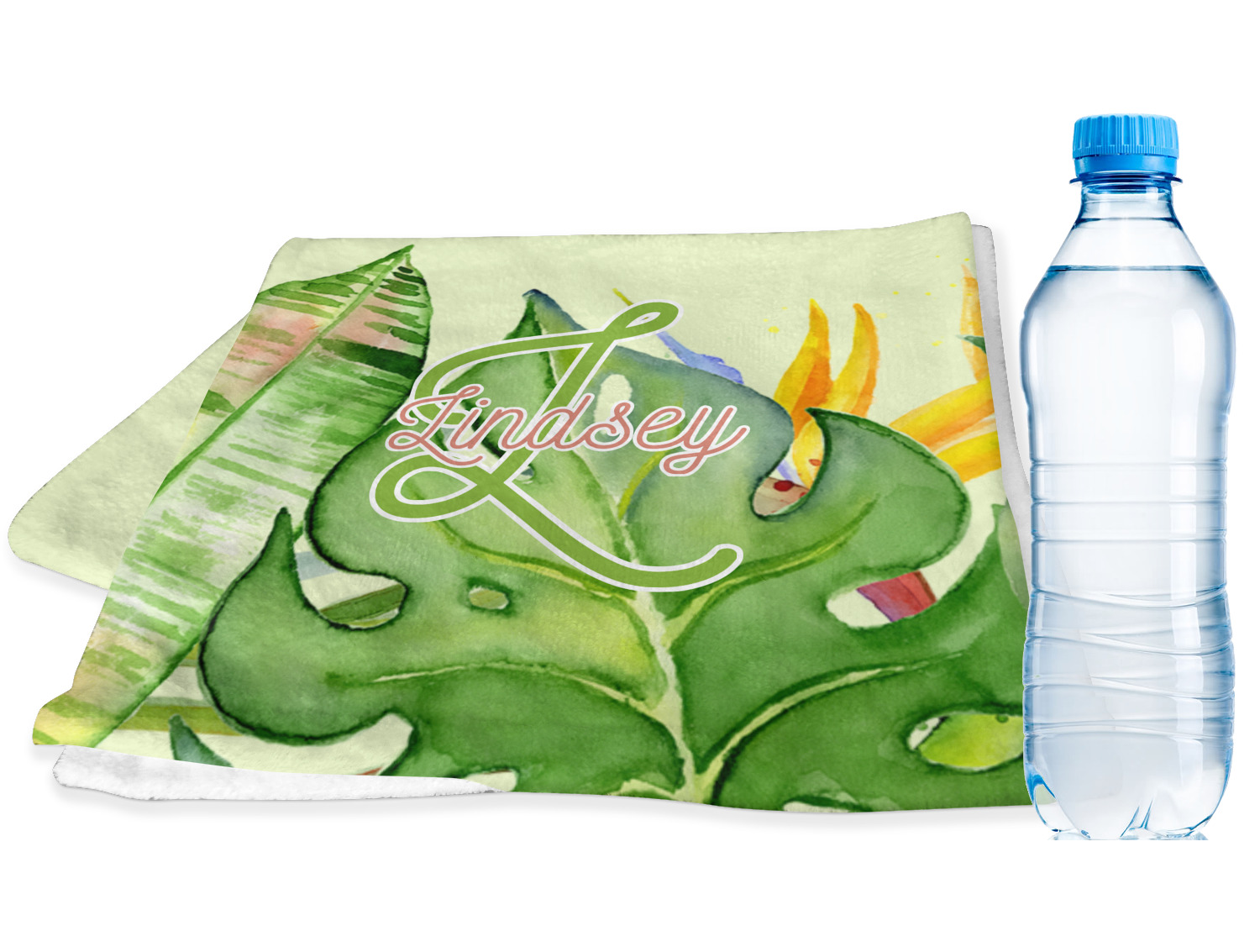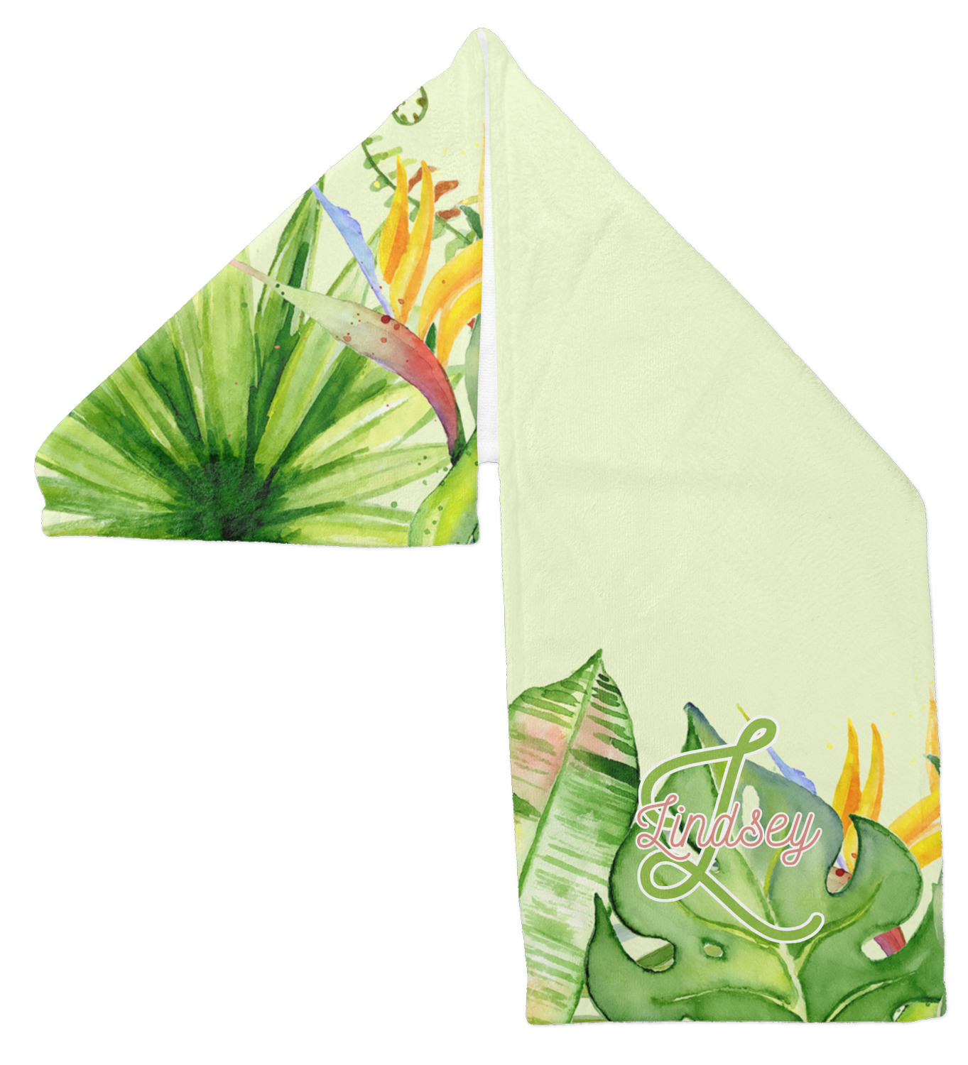 This design has a calming light green background. The foreground is filled with pops of dark green, lime, yellow, and a soft red. The tropical leaves really pop out at you as if they were real. The leaves are in a border or frame sort of formation surrounding a name and initial. This is a gorgeous design that looks a little bit different on each product it is on.