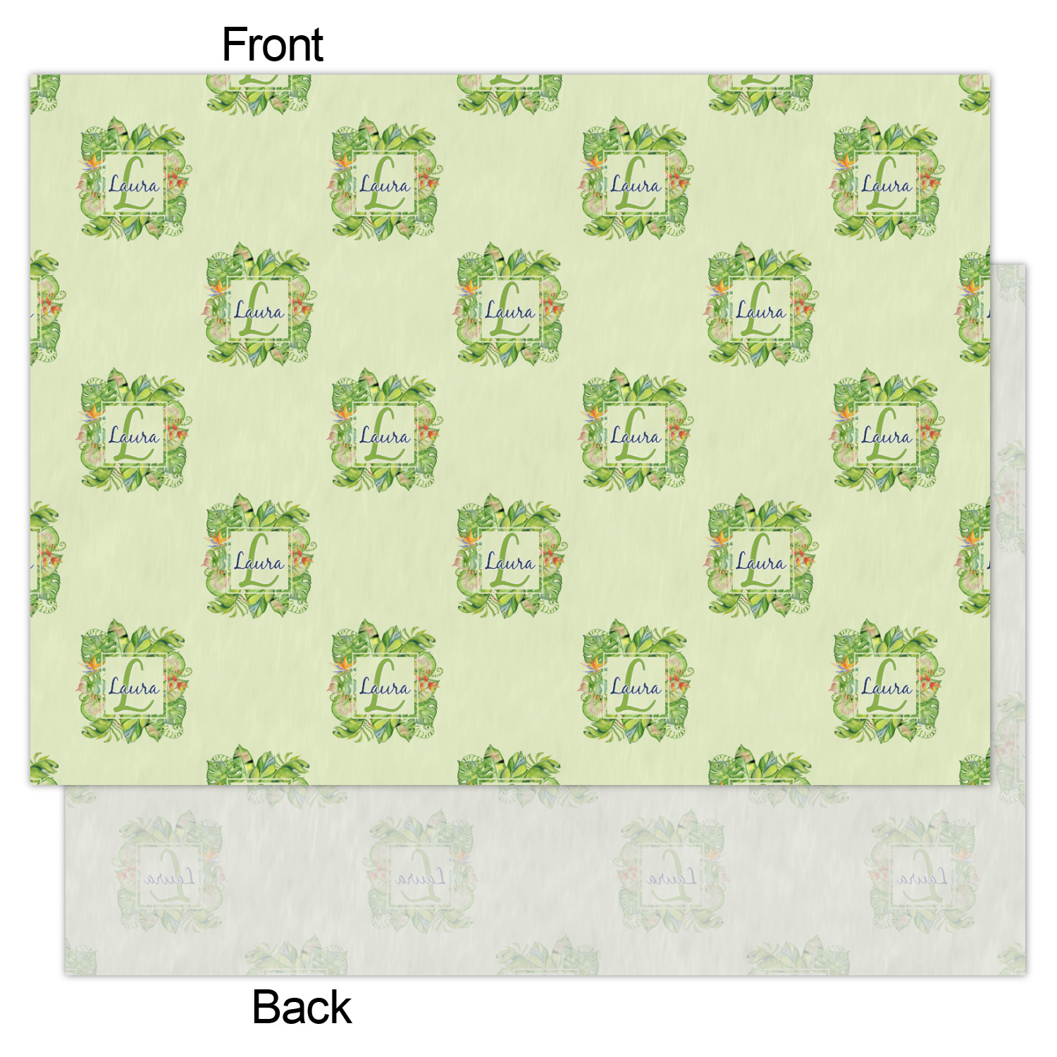 This design has a calming light green background. The foreground is filled with pops of dark green, lime, yellow, and a soft red. The tropical leaves really pop out at you as if they were real. The leaves are in a border or frame sort of formation surrounding a name and initial. This is a gorgeous design that looks a little bit different on each product it is on.