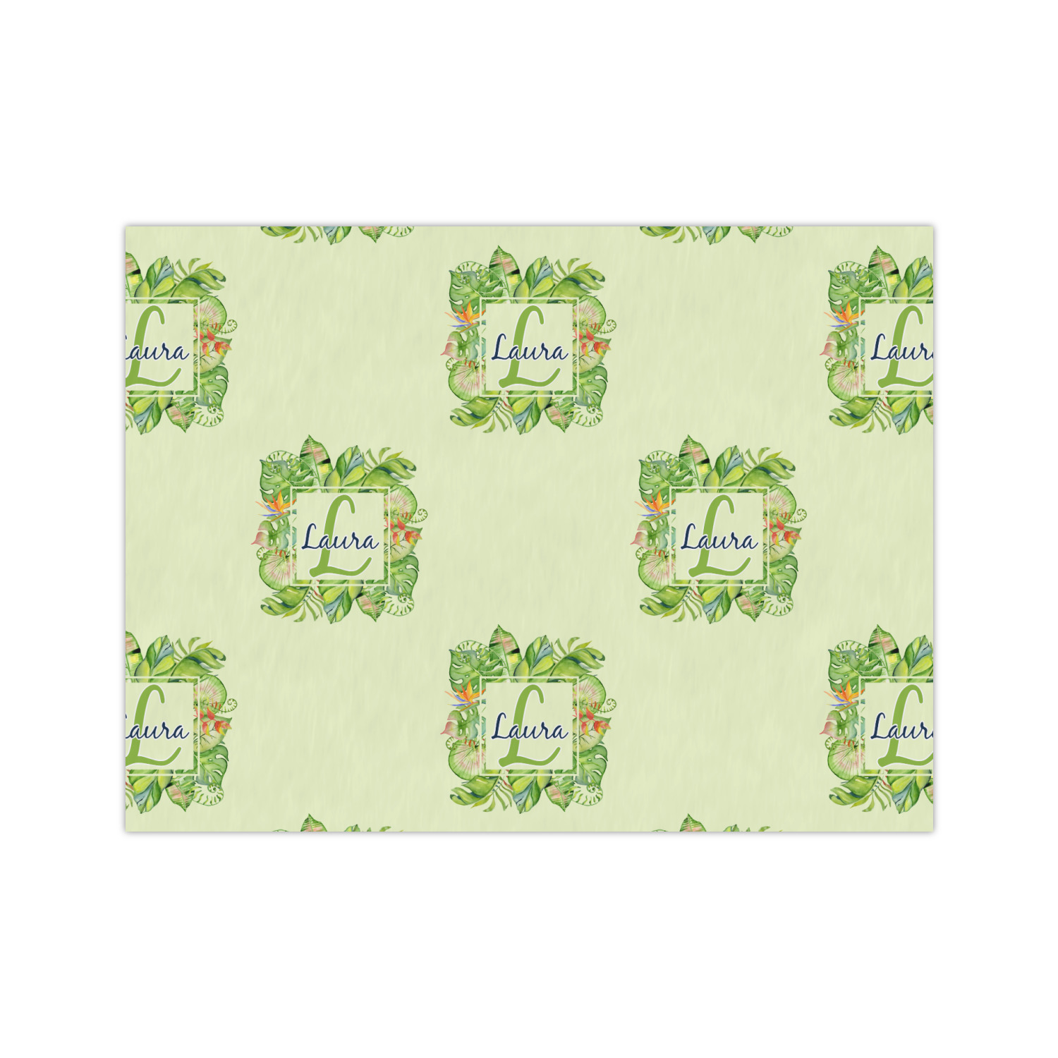 This design has a calming light green background. The foreground is filled with pops of dark green, lime, yellow, and a soft red. The tropical leaves really pop out at you as if they were real. The leaves are in a border or frame sort of formation surrounding a name and initial. This is a gorgeous design that looks a little bit different on each product it is on.