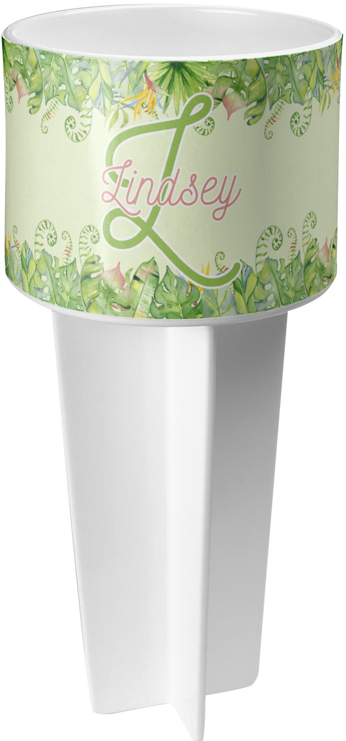 This cup holder has a large stake at its bottom that anchors it to the sand or ground below, while the cup holder rests above the stake. The entire drink holder is made of durable plastic and displays your customization around the cup holder portion. We sell these personalized beach spikers in two different colors: black and white.