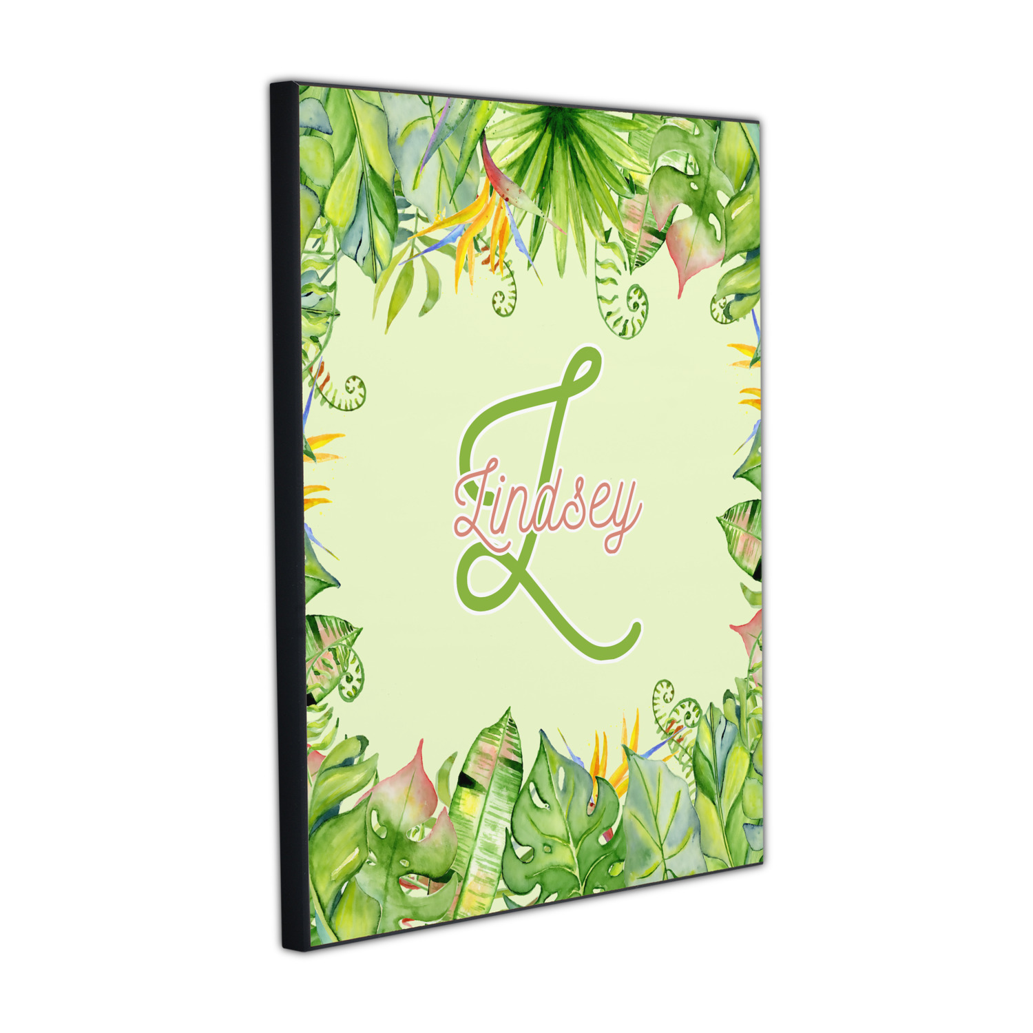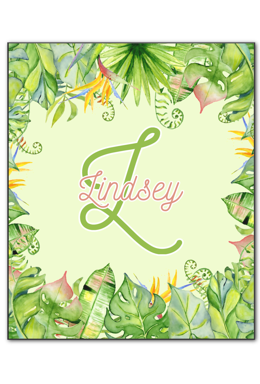 This design has a calming light green background. The foreground is filled with pops of dark green, lime, yellow, and a soft red. The tropical leaves really pop out at you as if they were real. The leaves are in a border or frame sort of formation surrounding a name and initial. This is a gorgeous design that looks a little bit different on each product it is on.