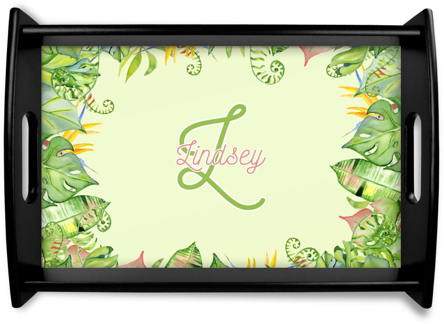 This design has a calming light green background. The foreground is filled with pops of dark green, lime, yellow, and a soft red. The tropical leaves really pop out at you as if they were real. The leaves are in a border or frame sort of formation surrounding a name and initial. This is a gorgeous design that looks a little bit different on each product it is on.