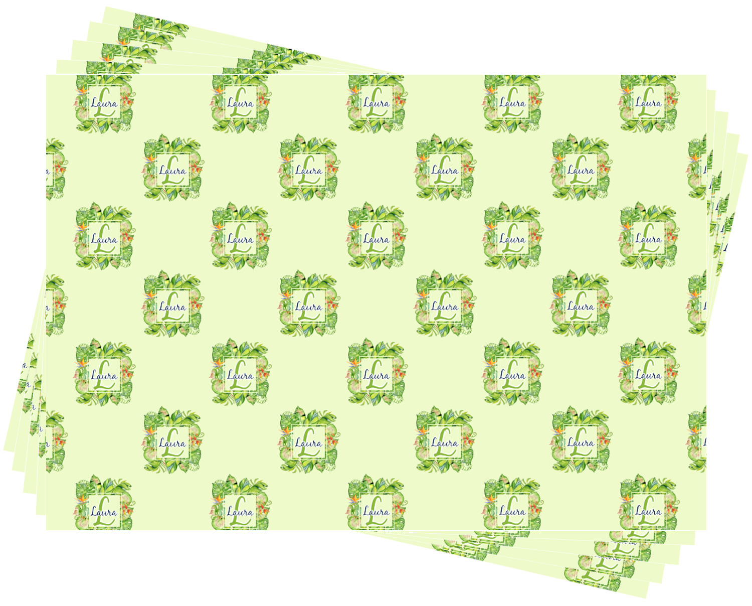 This design has a calming light green background. The foreground is filled with pops of dark green, lime, yellow, and a soft red. The tropical leaves really pop out at you as if they were real. The leaves are in a border or frame sort of formation surrounding a name and initial. This is a gorgeous design that looks a little bit different on each product it is on.