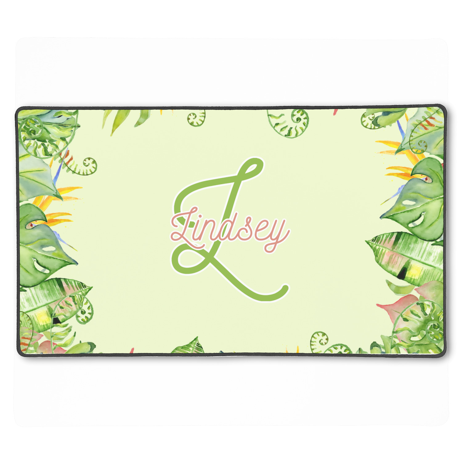 This design has a calming light green background. The foreground is filled with pops of dark green, lime, yellow, and a soft red. The tropical leaves really pop out at you as if they were real. The leaves are in a border or frame sort of formation surrounding a name and initial. This is a gorgeous design that looks a little bit different on each product it is on.