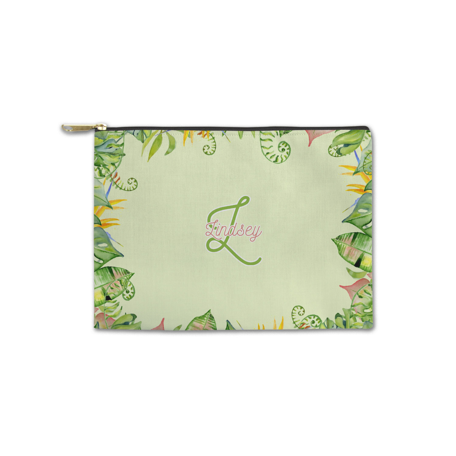 This design has a calming light green background. The foreground is filled with pops of dark green, lime, yellow, and a soft red. The tropical leaves really pop out at you as if they were real. The leaves are in a border or frame sort of formation surrounding a name and initial. This is a gorgeous design that looks a little bit different on each product it is on.