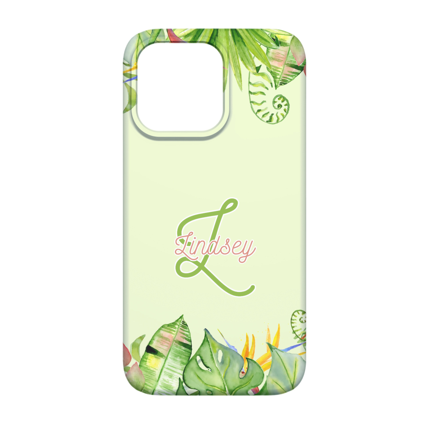 This design has a calming light green background. The foreground is filled with pops of dark green, lime, yellow, and a soft red. The tropical leaves really pop out at you as if they were real. The leaves are in a border or frame sort of formation surrounding a name and initial. This is a gorgeous design that looks a little bit different on each product it is on.