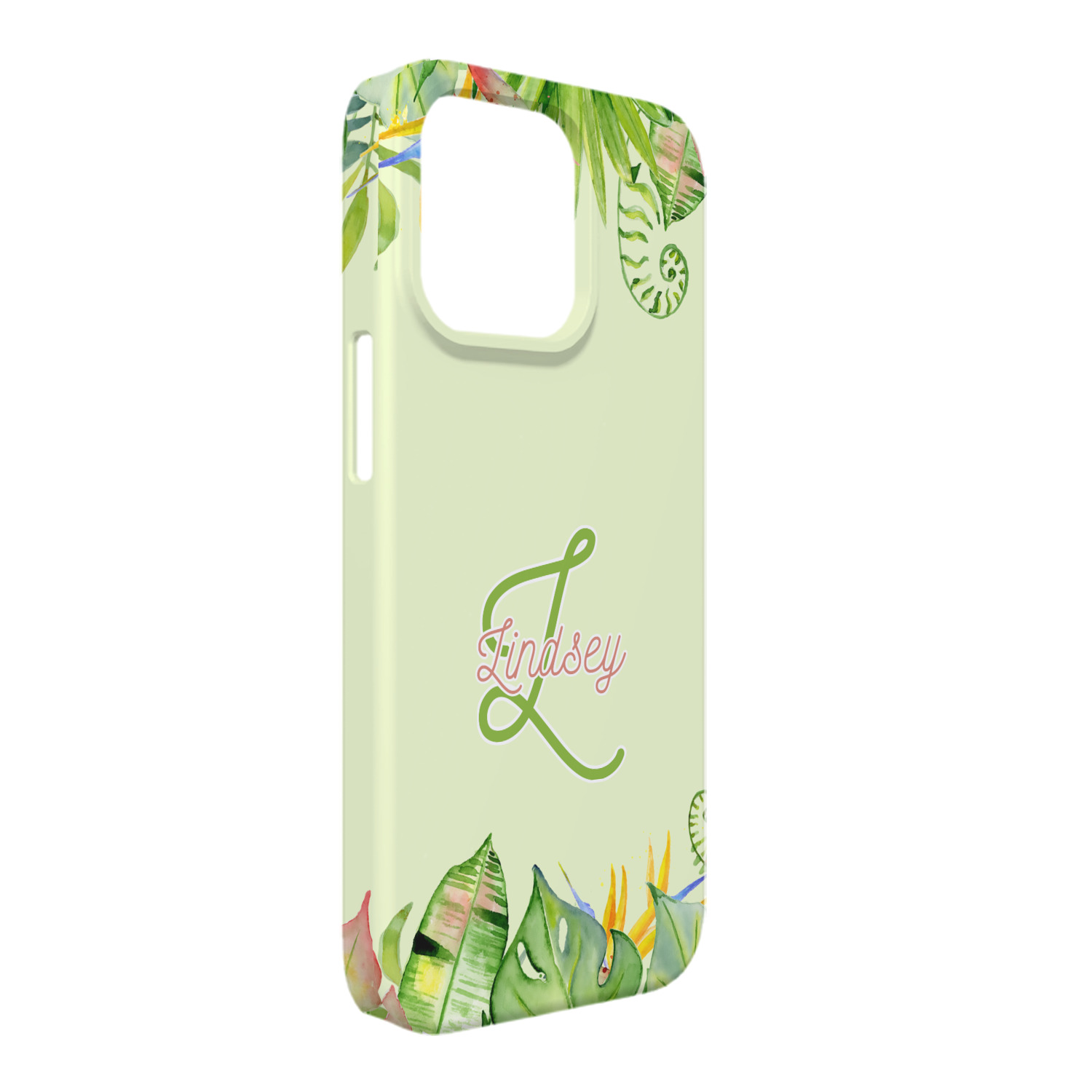 This design has a calming light green background. The foreground is filled with pops of dark green, lime, yellow, and a soft red. The tropical leaves really pop out at you as if they were real. The leaves are in a border or frame sort of formation surrounding a name and initial. This is a gorgeous design that looks a little bit different on each product it is on.