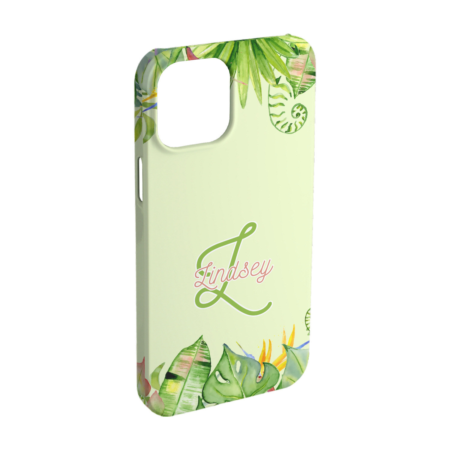 This design has a calming light green background. The foreground is filled with pops of dark green, lime, yellow, and a soft red. The tropical leaves really pop out at you as if they were real. The leaves are in a border or frame sort of formation surrounding a name and initial. This is a gorgeous design that looks a little bit different on each product it is on.
