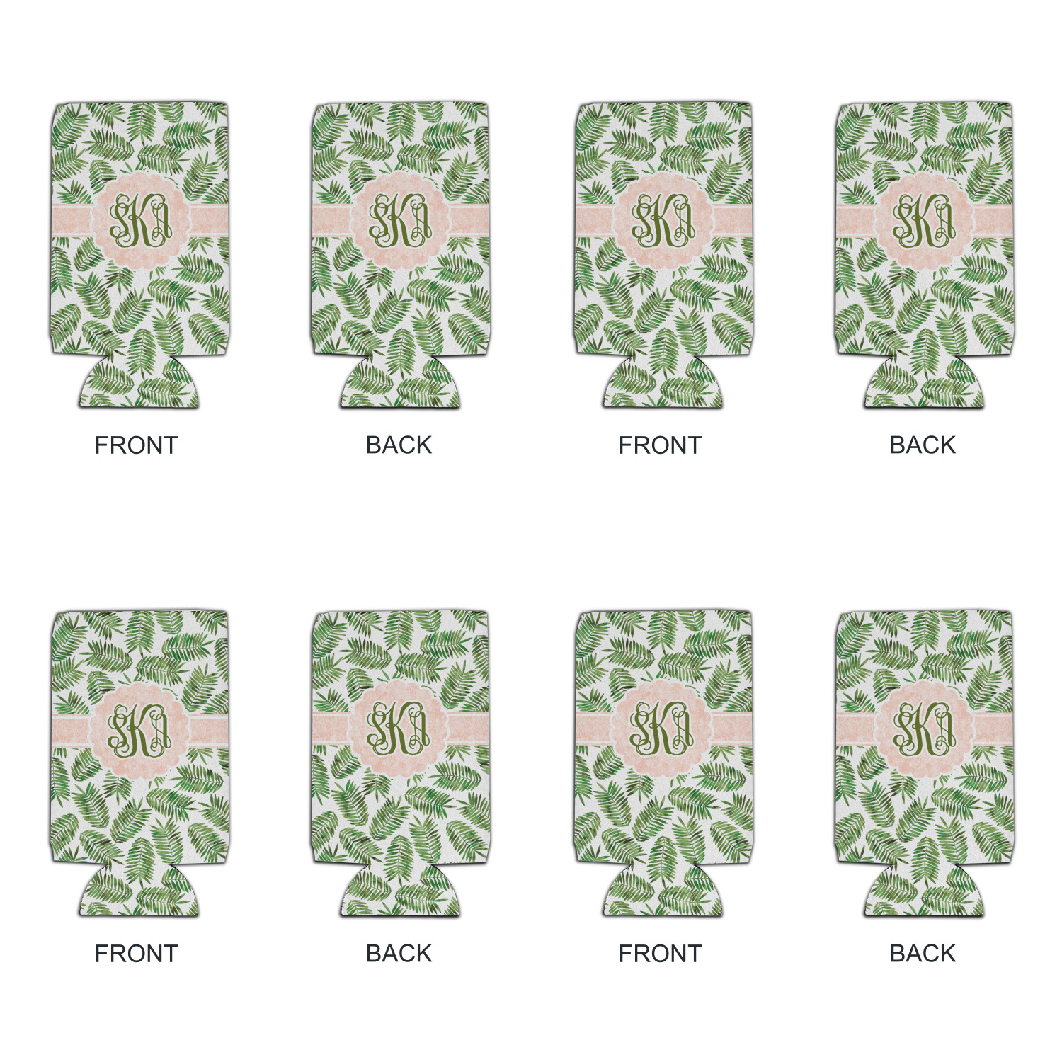The background of the main design is filled with thin tropical leaves scattered about. The leaves are filled with a dark green watercolor texture. The ribbon and scalloped frame are filled with a light peach watercolor texture. The monogram in the middle gives an extra feminine touch to this design.