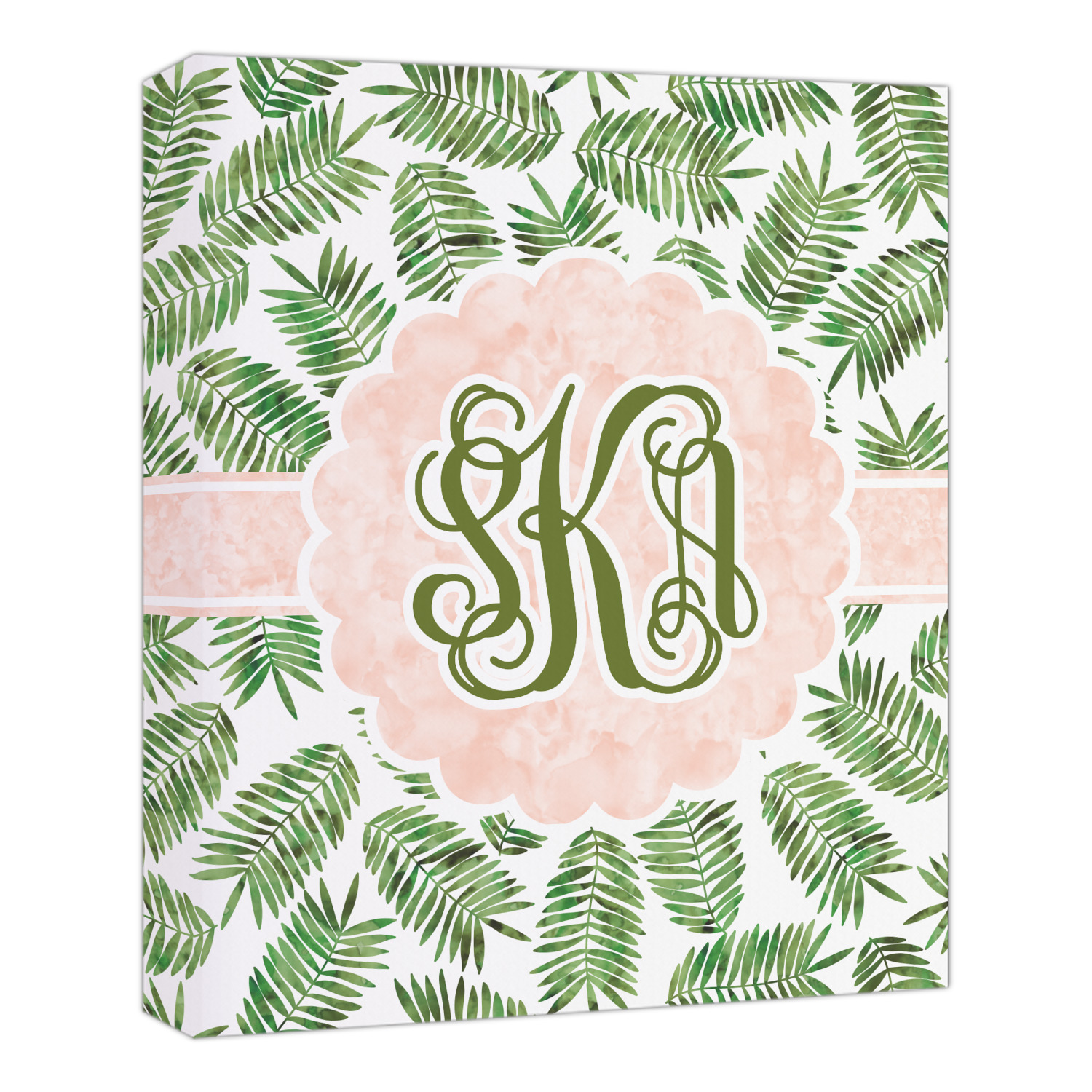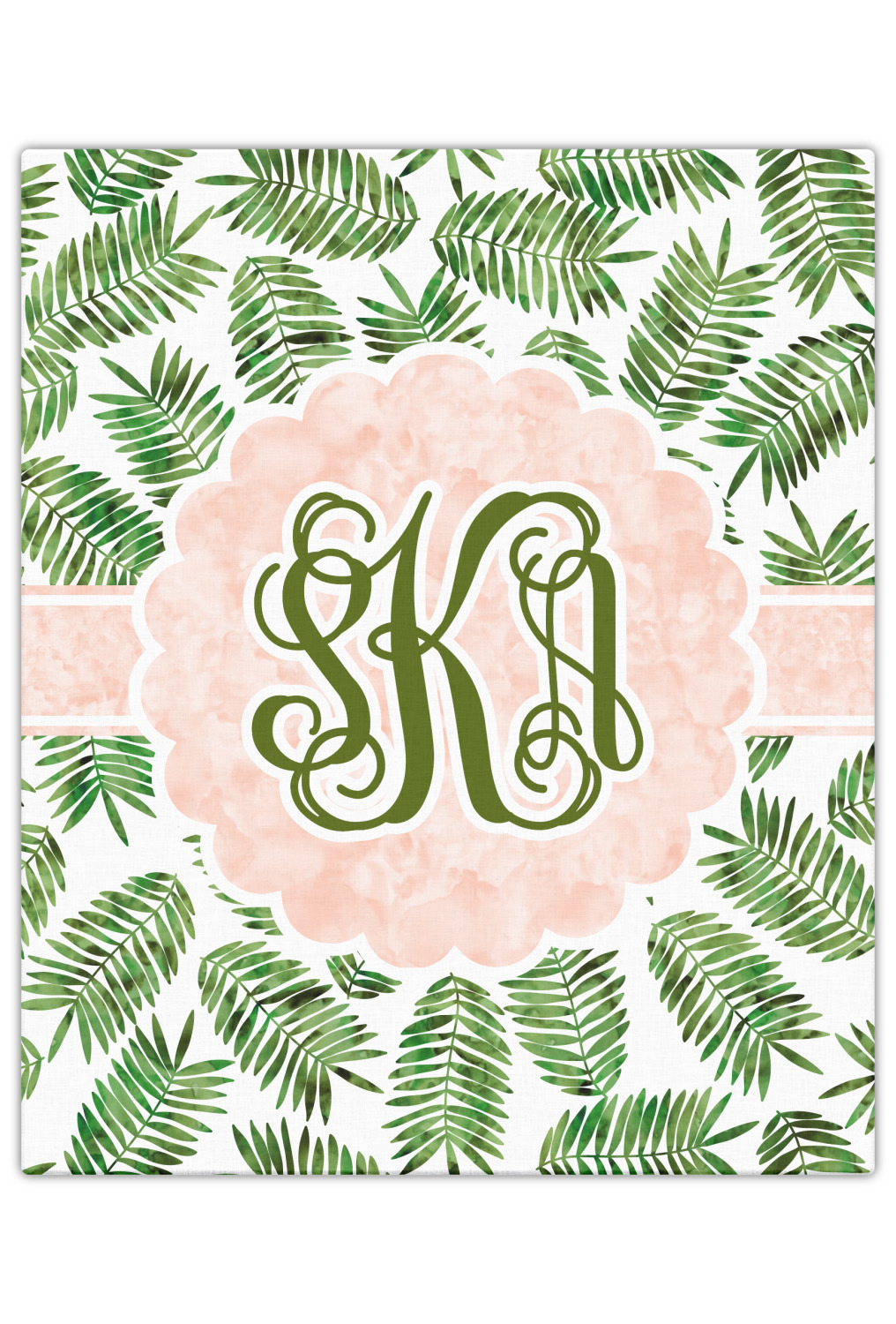 The background of the main design is filled with thin tropical leaves scattered about. The leaves are filled with a dark green watercolor texture. The ribbon and scalloped frame are filled with a light peach watercolor texture. The monogram in the middle gives an extra feminine touch to this design.