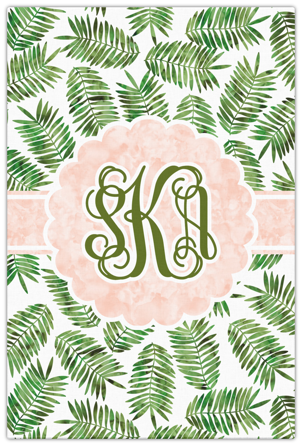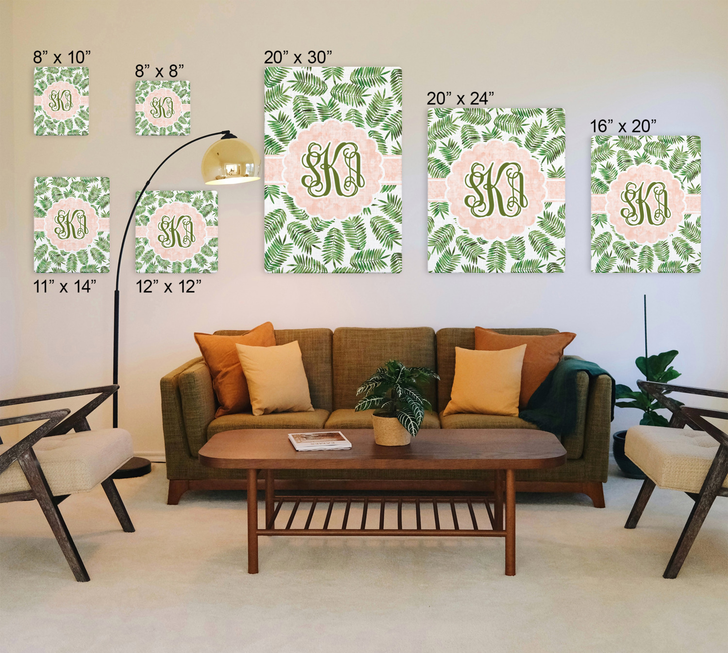 The background of the main design is filled with thin tropical leaves scattered about. The leaves are filled with a dark green watercolor texture. The ribbon and scalloped frame are filled with a light peach watercolor texture. The monogram in the middle gives an extra feminine touch to this design.