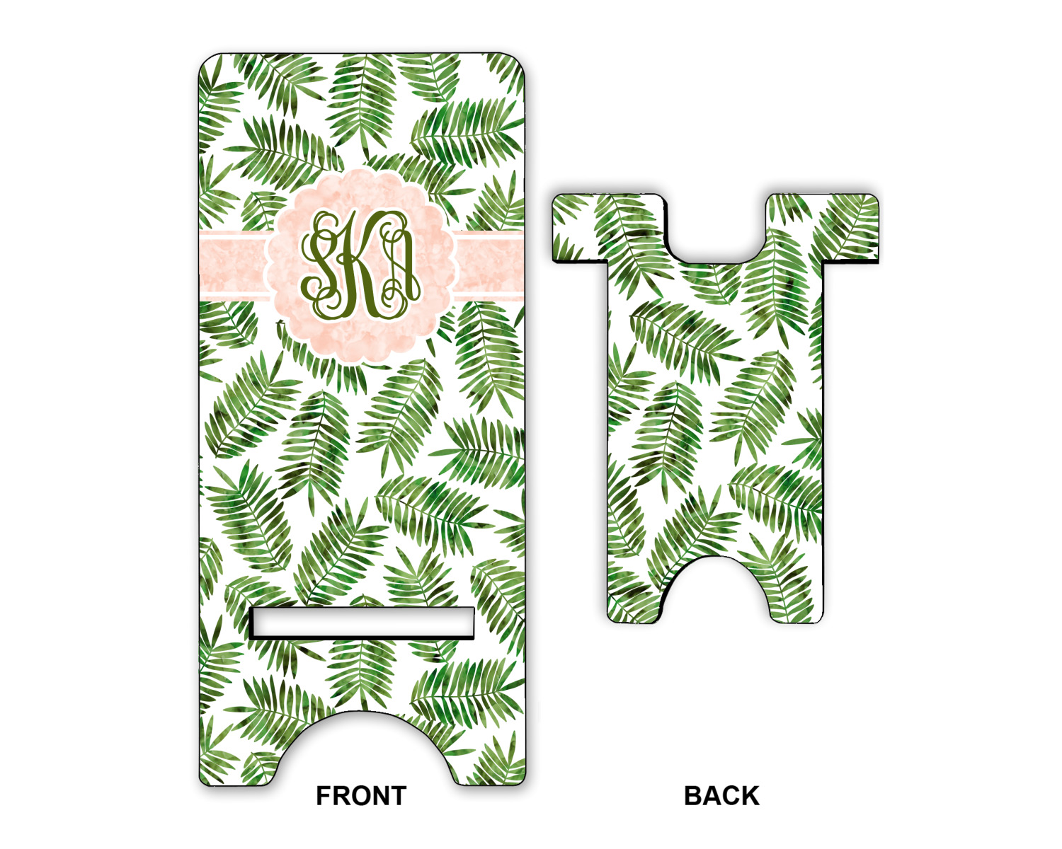 The background of the main design is filled with thin tropical leaves scattered about. The leaves are filled with a dark green watercolor texture. The ribbon and scalloped frame are filled with a light peach watercolor texture. The monogram in the middle gives an extra feminine touch to this design.