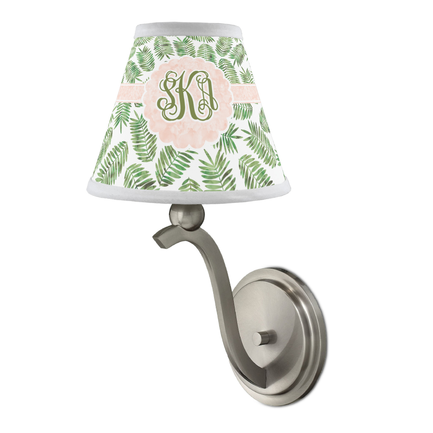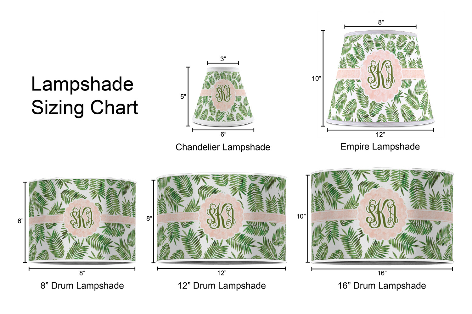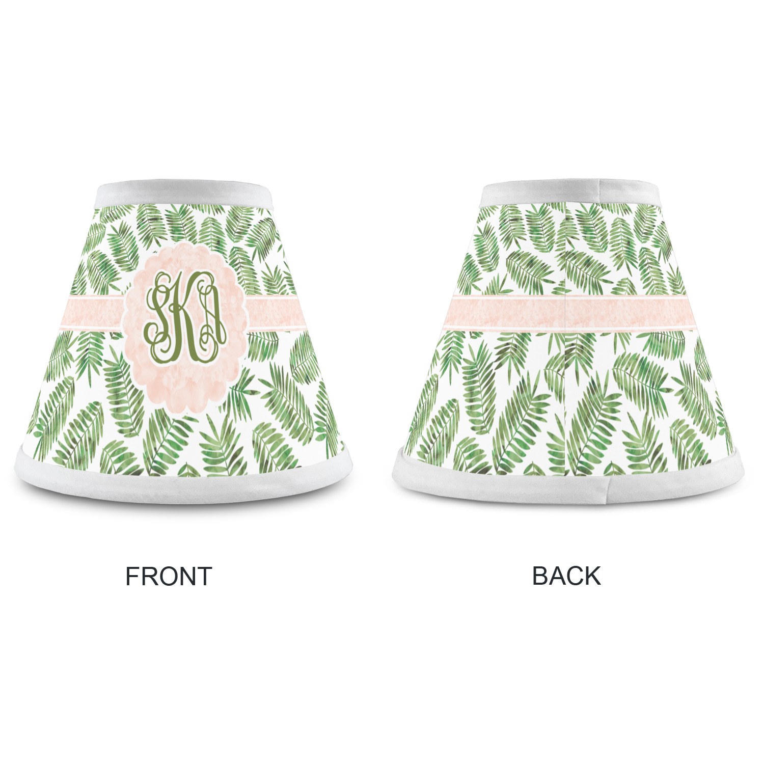 The background of the main design is filled with thin tropical leaves scattered about. The leaves are filled with a dark green watercolor texture. The ribbon and scalloped frame are filled with a light peach watercolor texture. The monogram in the middle gives an extra feminine touch to this design.