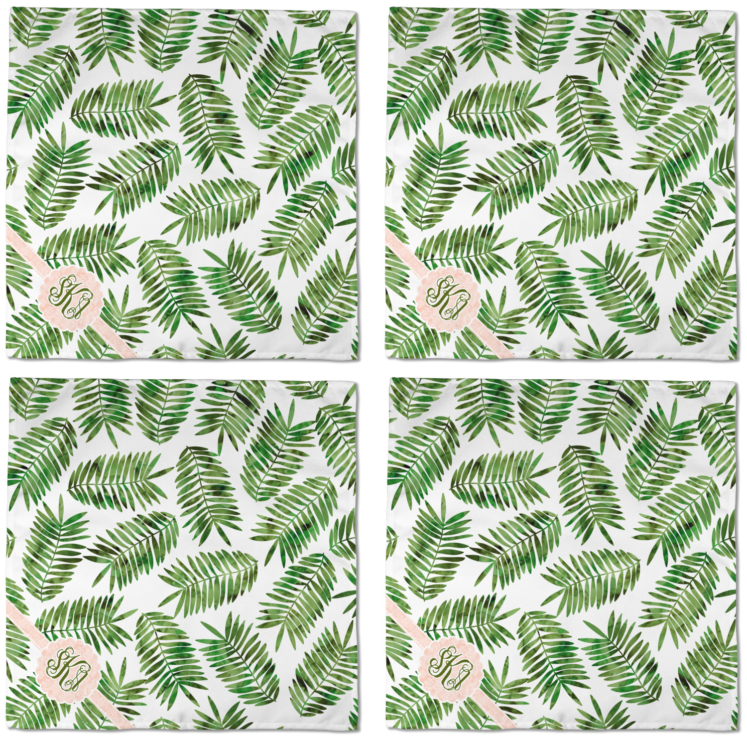The background of the main design is filled with thin tropical leaves scattered about. The leaves are filled with a dark green watercolor texture. The ribbon and scalloped frame are filled with a light peach watercolor texture. The monogram in the middle gives an extra feminine touch to this design.
