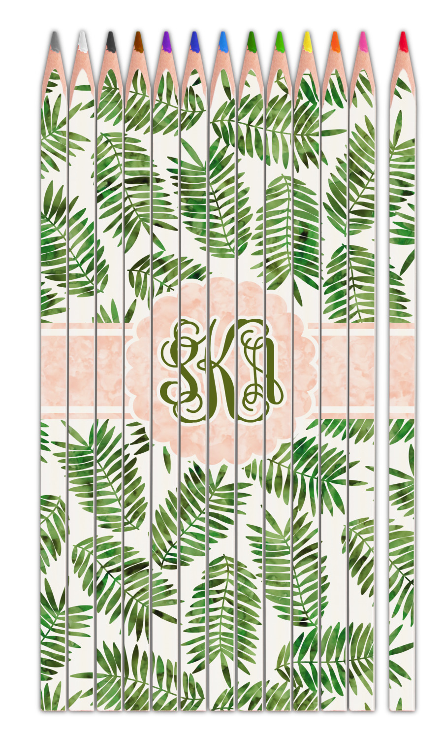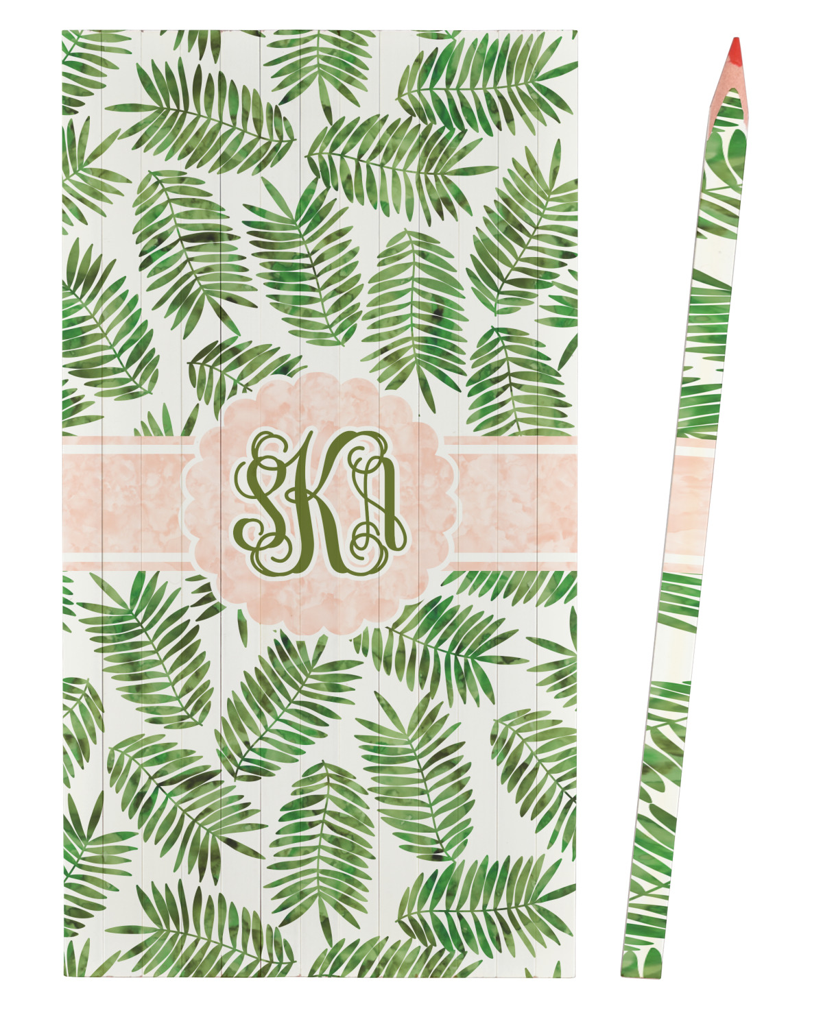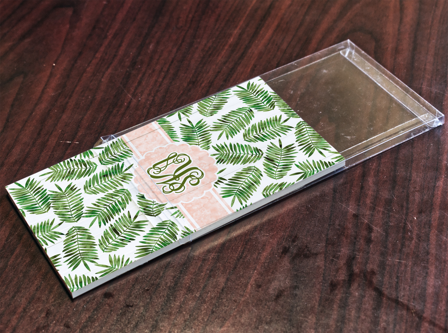 The background of the main design is filled with thin tropical leaves scattered about. The leaves are filled with a dark green watercolor texture. The ribbon and scalloped frame are filled with a light peach watercolor texture. The monogram in the middle gives an extra feminine touch to this design.