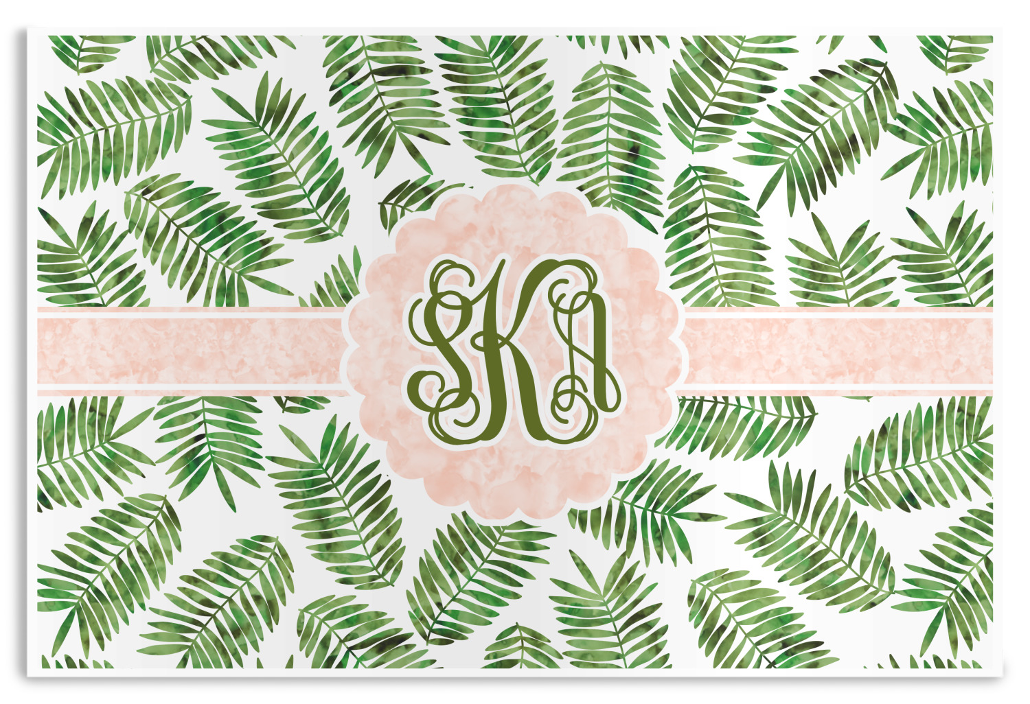 The background of the main design is filled with thin tropical leaves scattered about. The leaves are filled with a dark green watercolor texture. The ribbon and scalloped frame are filled with a light peach watercolor texture. The monogram in the middle gives an extra feminine touch to this design.