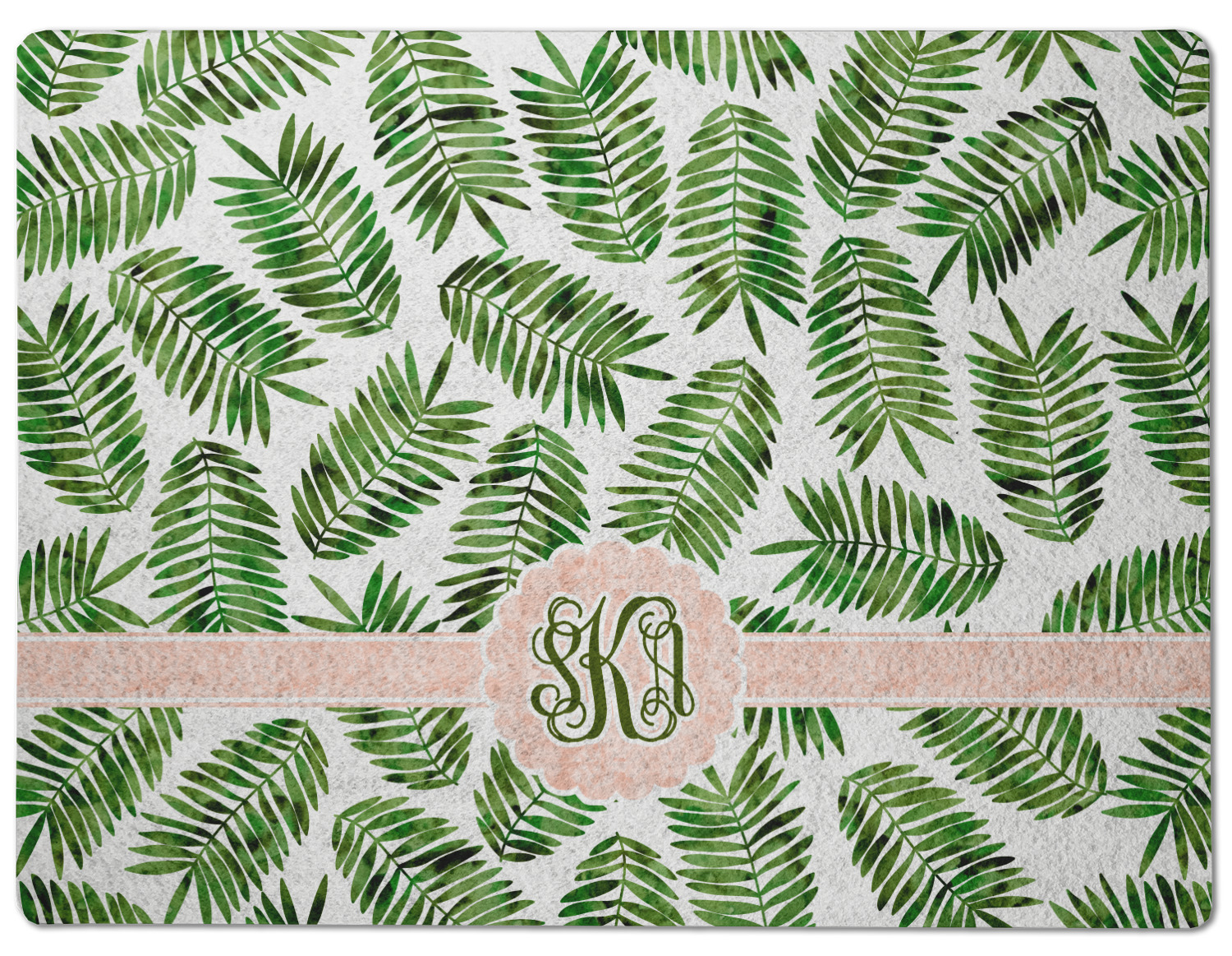 The background of the main design is filled with thin tropical leaves scattered about. The leaves are filled with a dark green watercolor texture. The ribbon and scalloped frame are filled with a light peach watercolor texture. The monogram in the middle gives an extra feminine touch to this design.