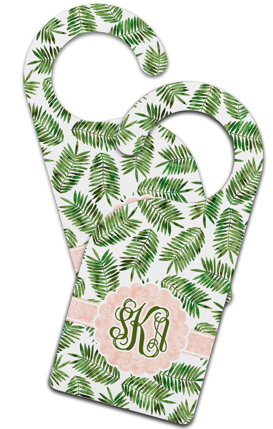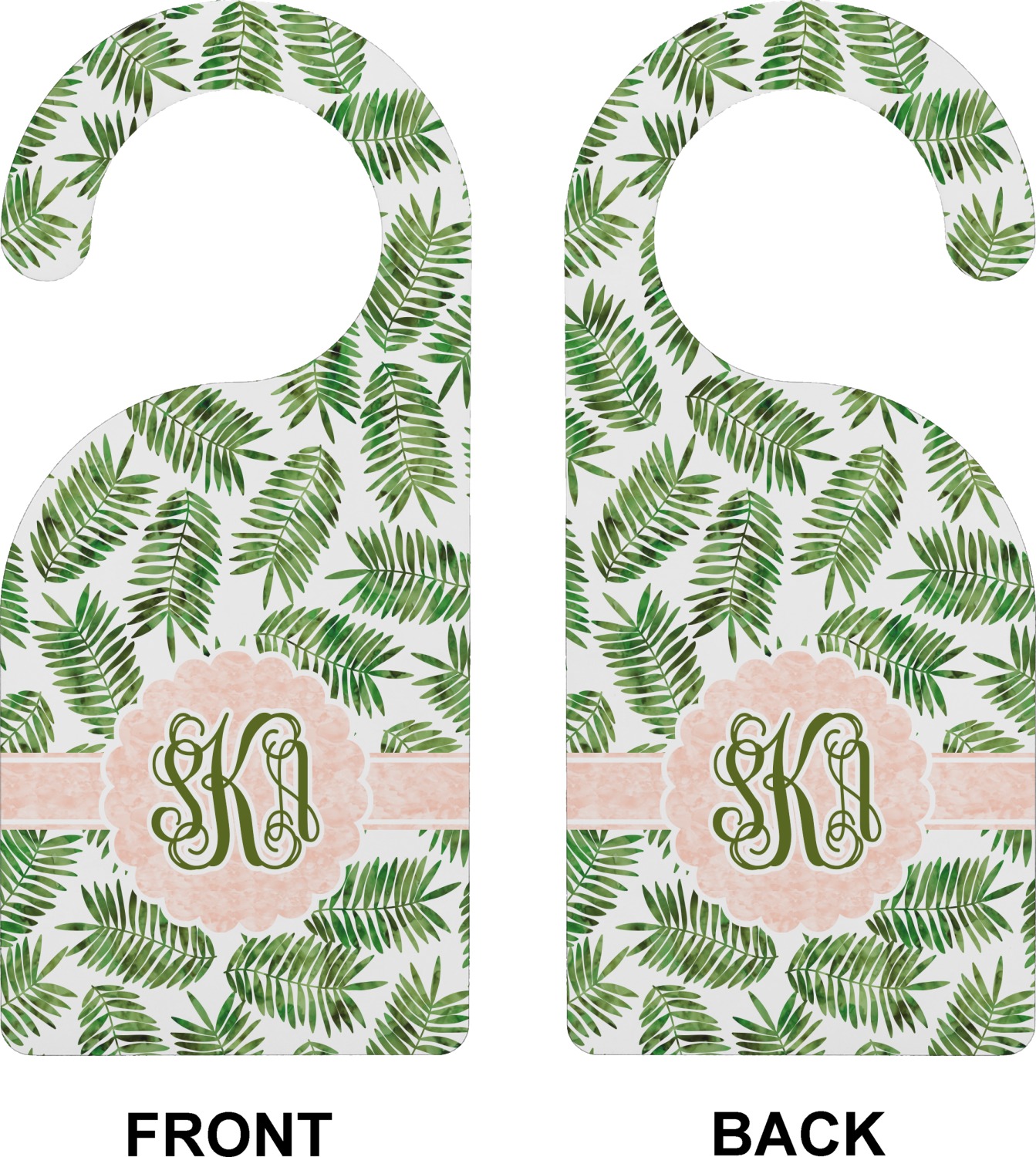 The background of the main design is filled with thin tropical leaves scattered about. The leaves are filled with a dark green watercolor texture. The ribbon and scalloped frame are filled with a light peach watercolor texture. The monogram in the middle gives an extra feminine touch to this design.