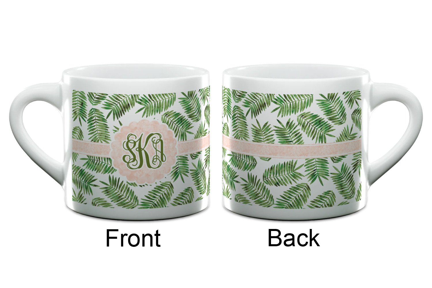 Each of our espresso mugs is a ceramic material sure to keep your drink warm. Personalize one cup for yourself, or order a set of 4! Its the perfect little gift for any coffee lover! We carry two sizes for you to personalize - 3 oz. (approx. 3.25" x 2.325" x 2.625") or 6 oz. (approx. 4" x 2.9" x 2.9"). Our 3 oz. mug is perfect for that single shot espresso while our 6 oz. mug can be your next favorite cappuccino cup holding two shots of espresso!