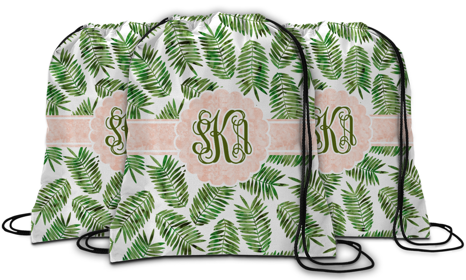 The background of the main design is filled with thin tropical leaves scattered about. The leaves are filled with a dark green watercolor texture. The ribbon and scalloped frame are filled with a light peach watercolor texture. The monogram in the middle gives an extra feminine touch to this design.