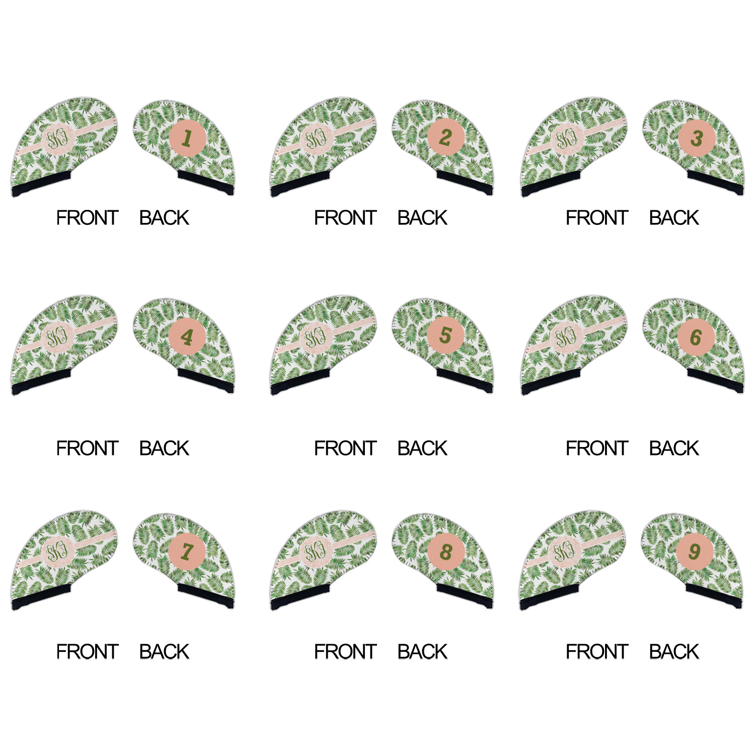 The background of the main design is filled with thin tropical leaves scattered about. The leaves are filled with a dark green watercolor texture. The ribbon and scalloped frame are filled with a light peach watercolor texture. The monogram in the middle gives an extra feminine touch to this design.