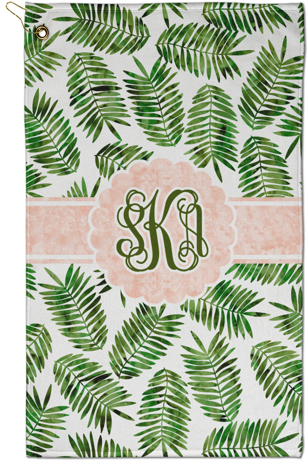 The towel is fully printed / patterned on the front polyester side; and is white on terrycloth cotton backside. The towel has grommet and a pear spring clip in the top left corner. Our golf towels are available in 100s of different prints and patterns.