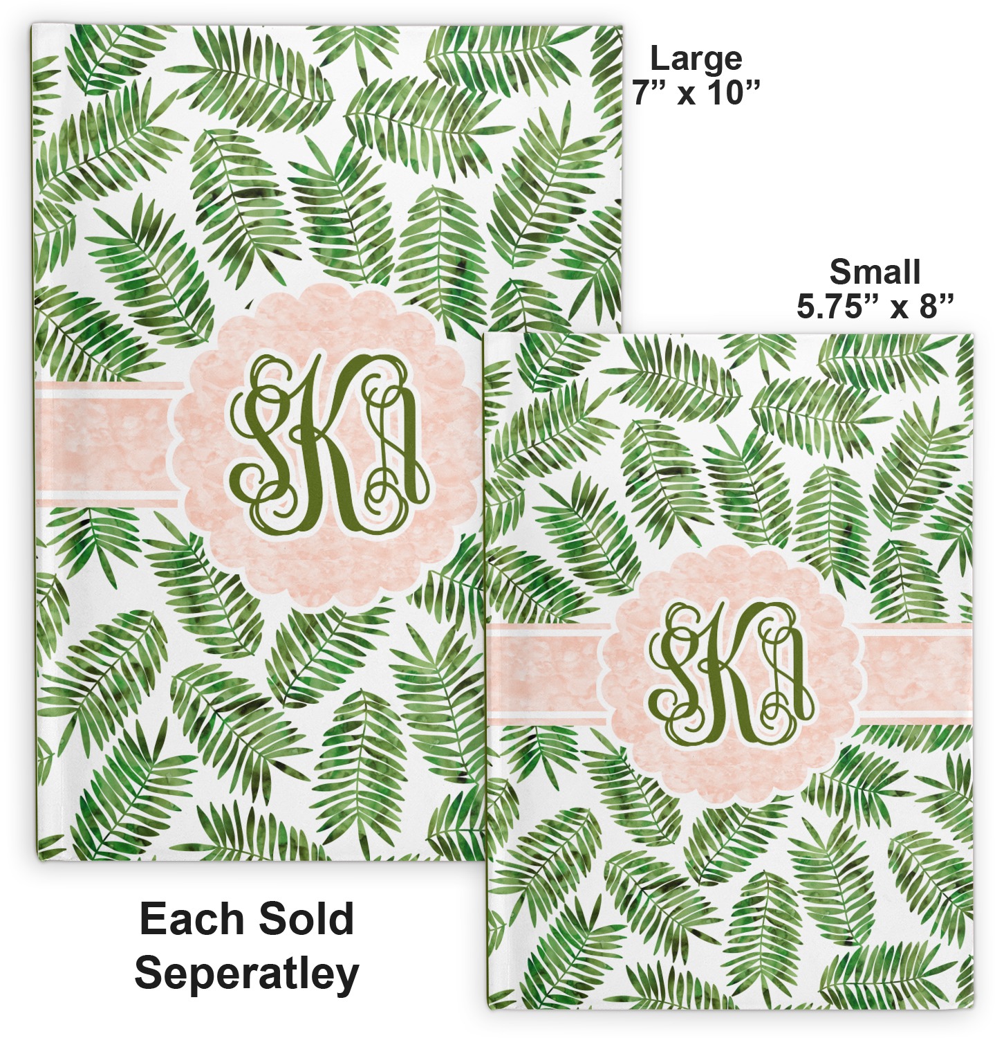 The background of the main design is filled with thin tropical leaves scattered about. The leaves are filled with a dark green watercolor texture. The ribbon and scalloped frame are filled with a light peach watercolor texture. The monogram in the middle gives an extra feminine touch to this design.