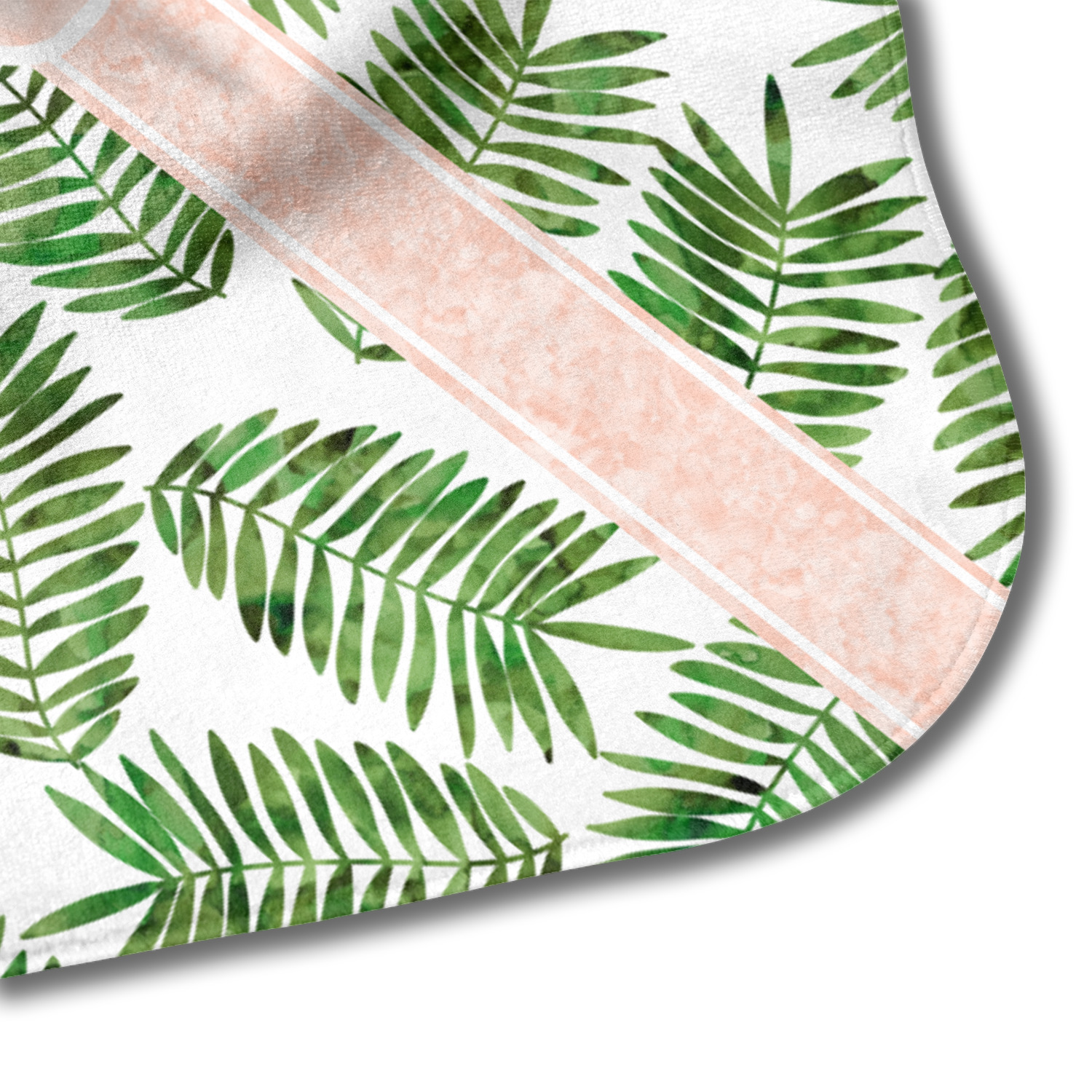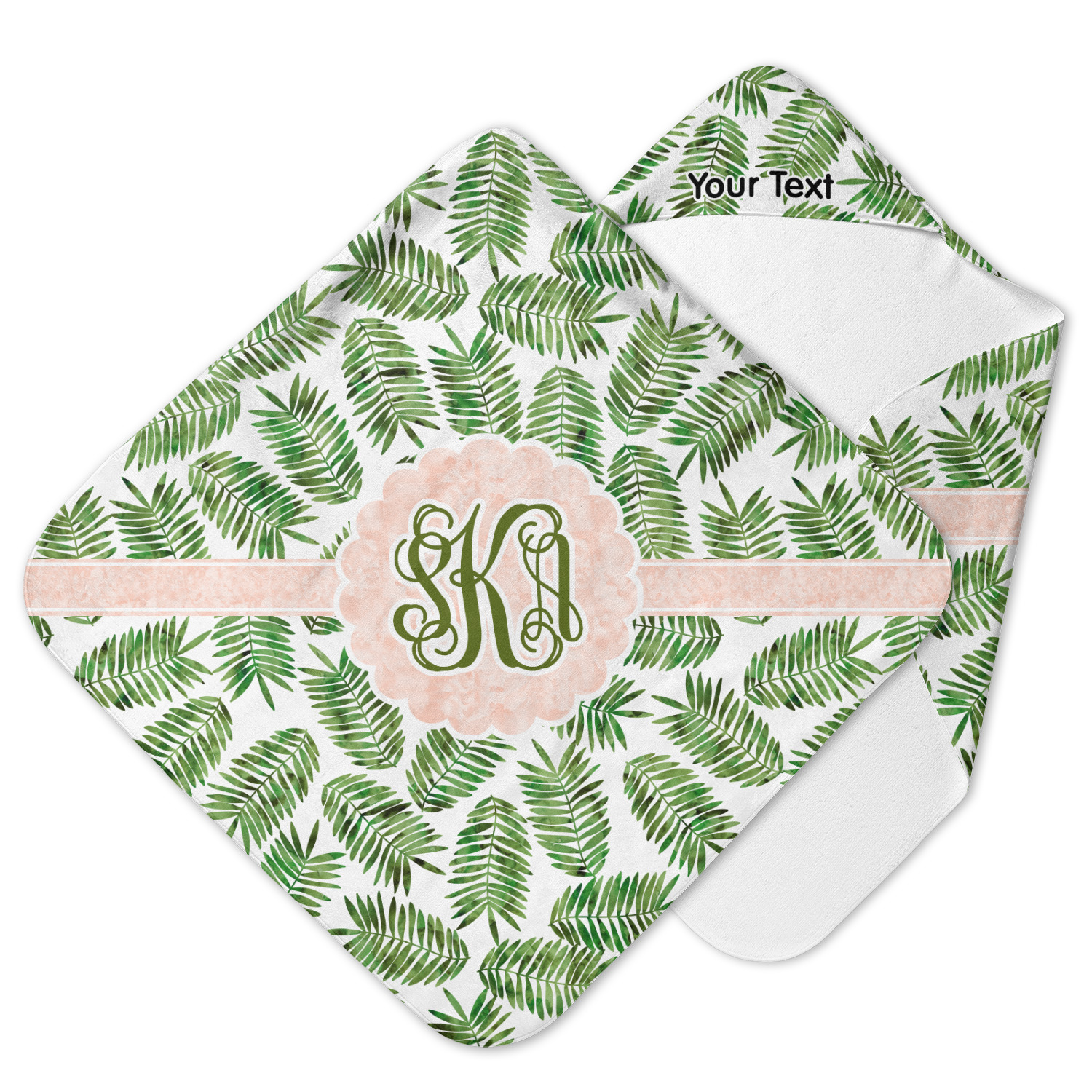 The background of the main design is filled with thin tropical leaves scattered about. The leaves are filled with a dark green watercolor texture. The ribbon and scalloped frame are filled with a light peach watercolor texture. The monogram in the middle gives an extra feminine touch to this design.