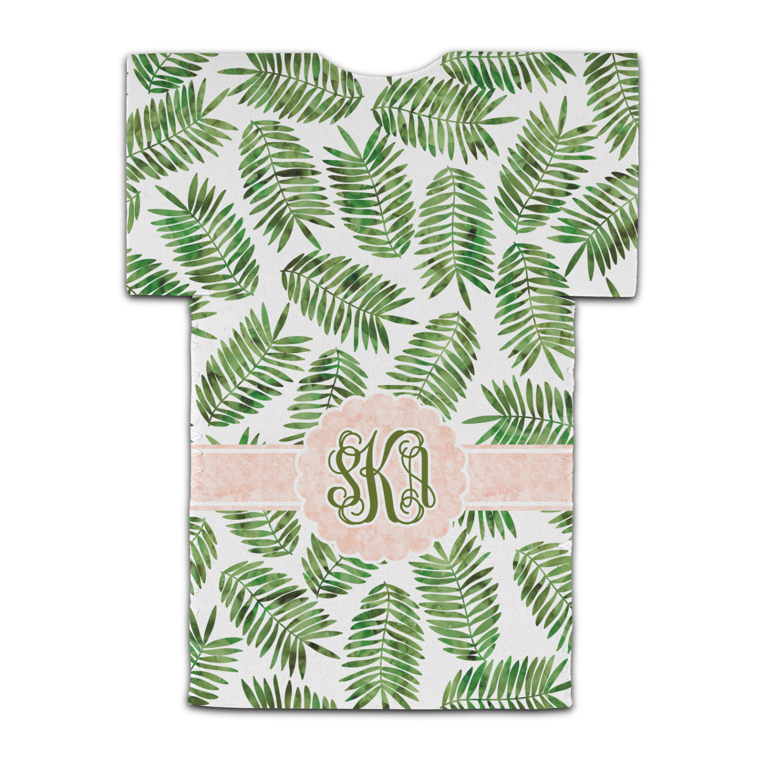 The background of the main design is filled with thin tropical leaves scattered about. The leaves are filled with a dark green watercolor texture. The ribbon and scalloped frame are filled with a light peach watercolor texture. The monogram in the middle gives an extra feminine touch to this design.