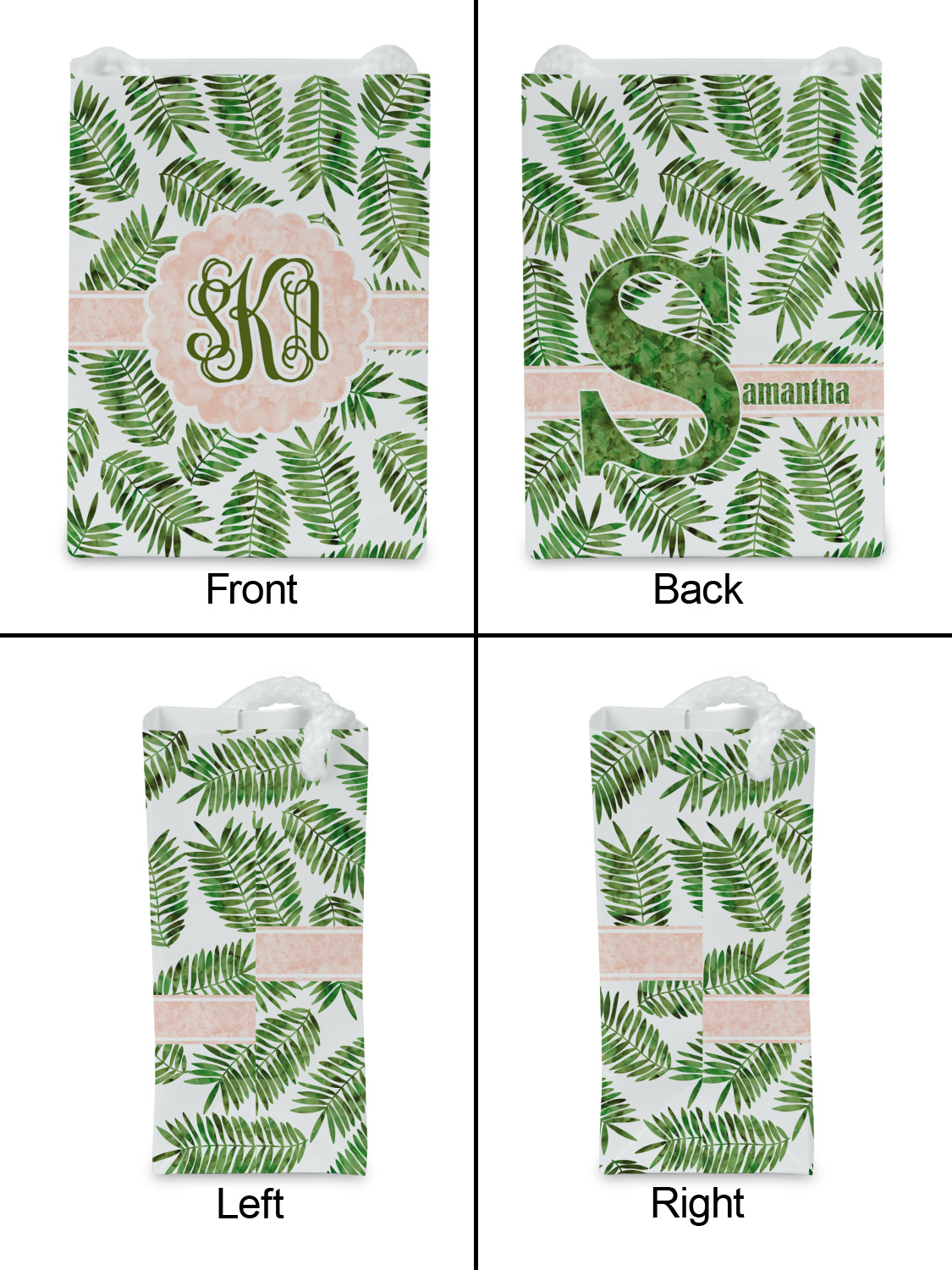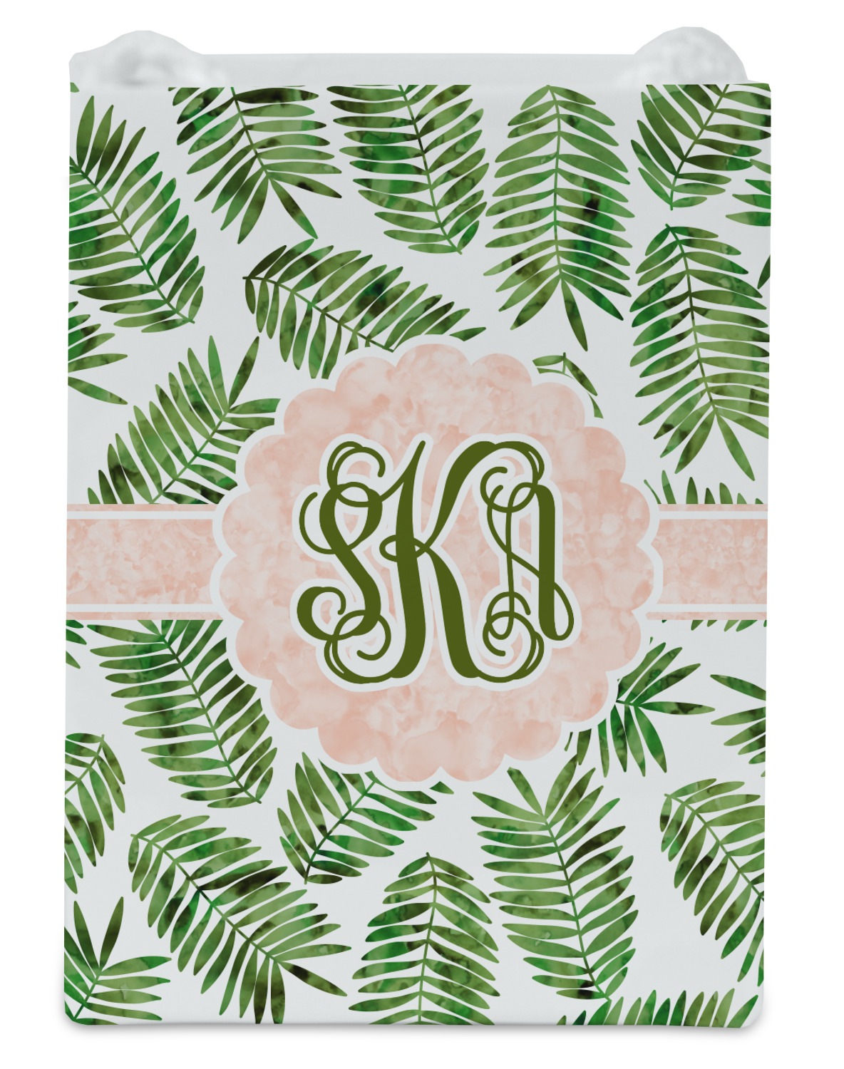 The background of the main design is filled with thin tropical leaves scattered about. The leaves are filled with a dark green watercolor texture. The ribbon and scalloped frame are filled with a light peach watercolor texture. The monogram in the middle gives an extra feminine touch to this design.