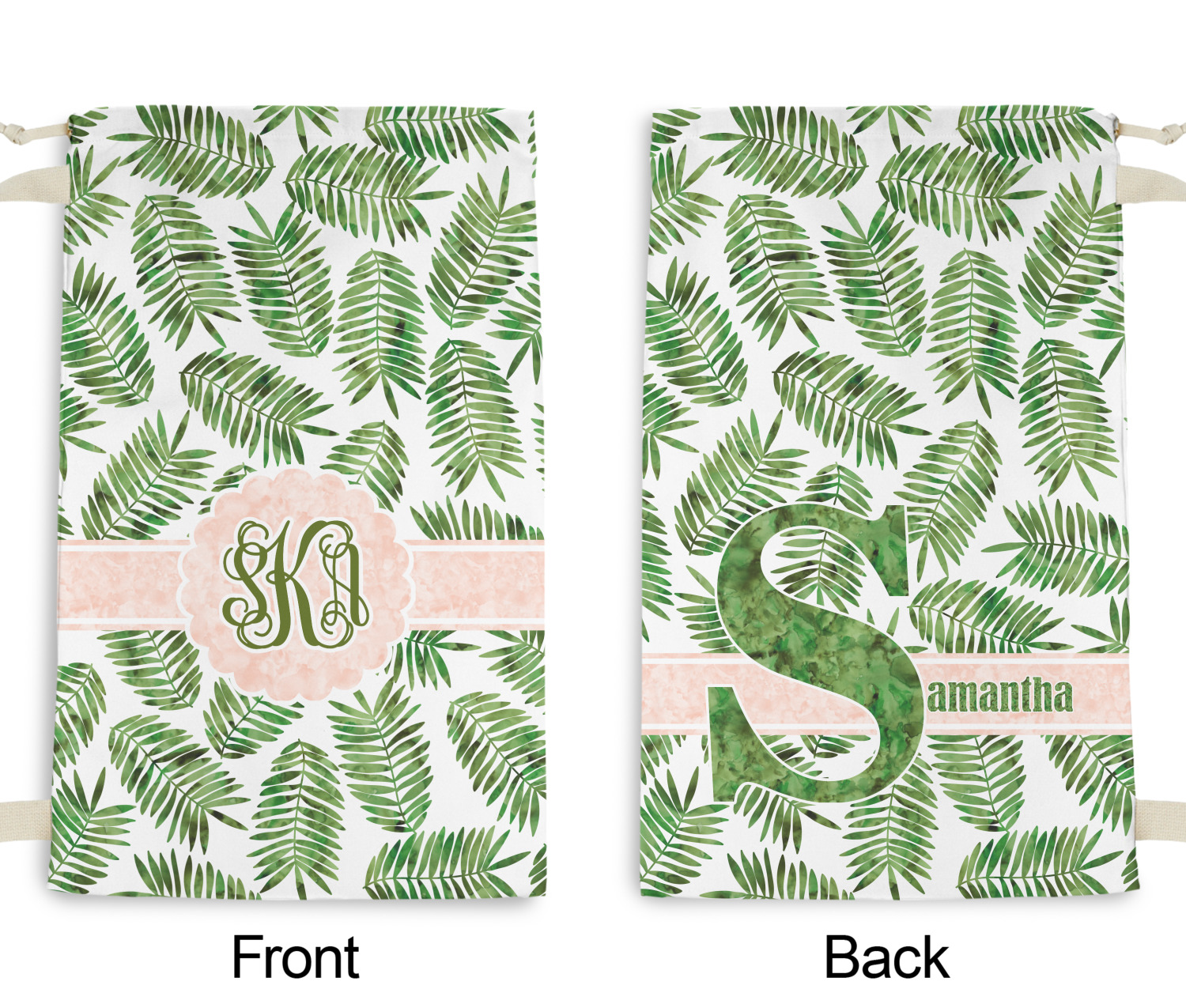 The background of the main design is filled with thin tropical leaves scattered about. The leaves are filled with a dark green watercolor texture. The ribbon and scalloped frame are filled with a light peach watercolor texture. The monogram in the middle gives an extra feminine touch to this design.