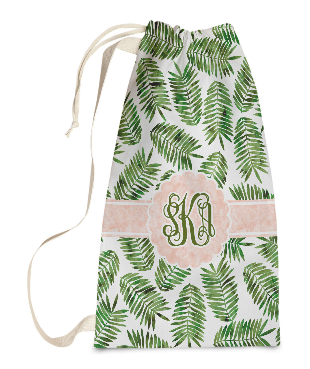 Carry your laundry in style with these customized laundry bags. Available in two sizes, featuring a natural colored woven strap and a cinch cord, these bags hold a lot of clothes or anything else you want to fit in them.