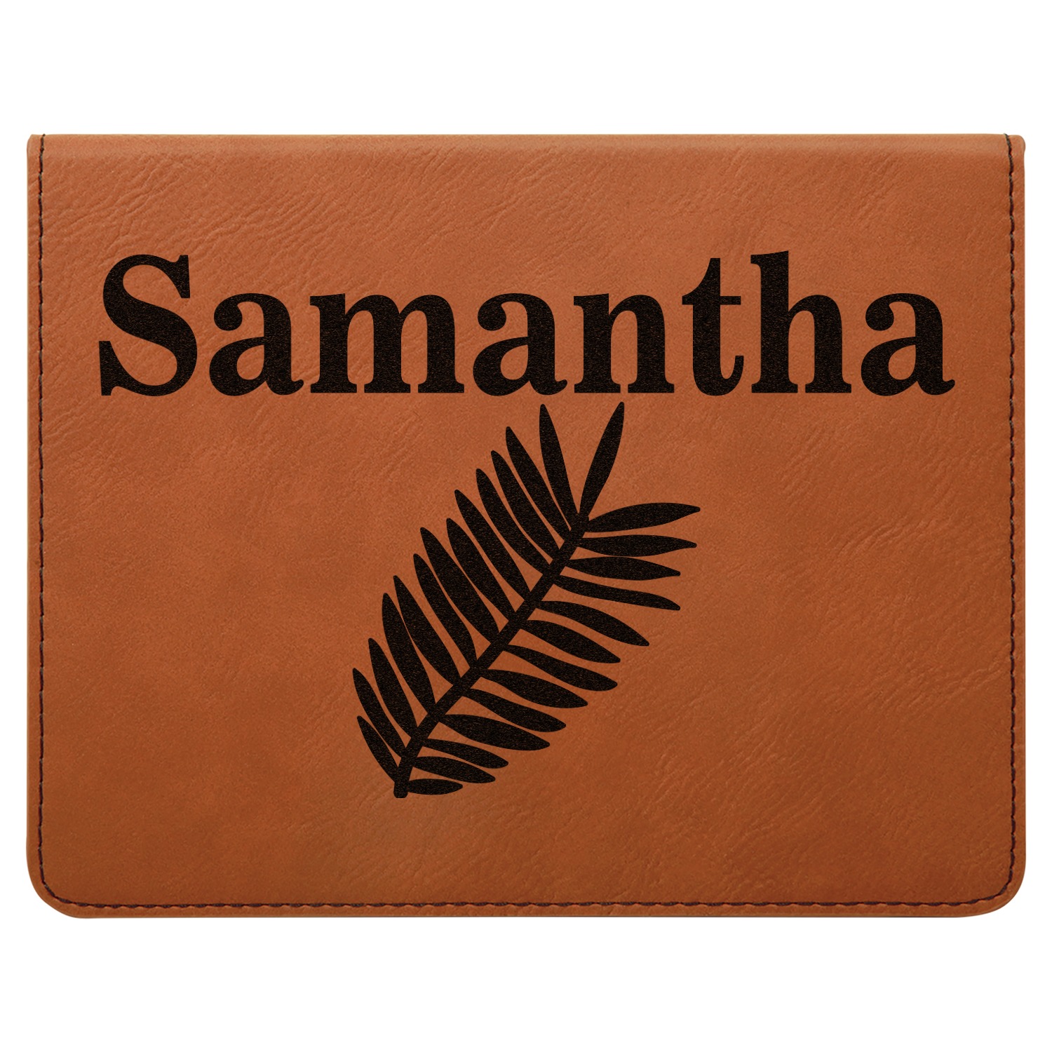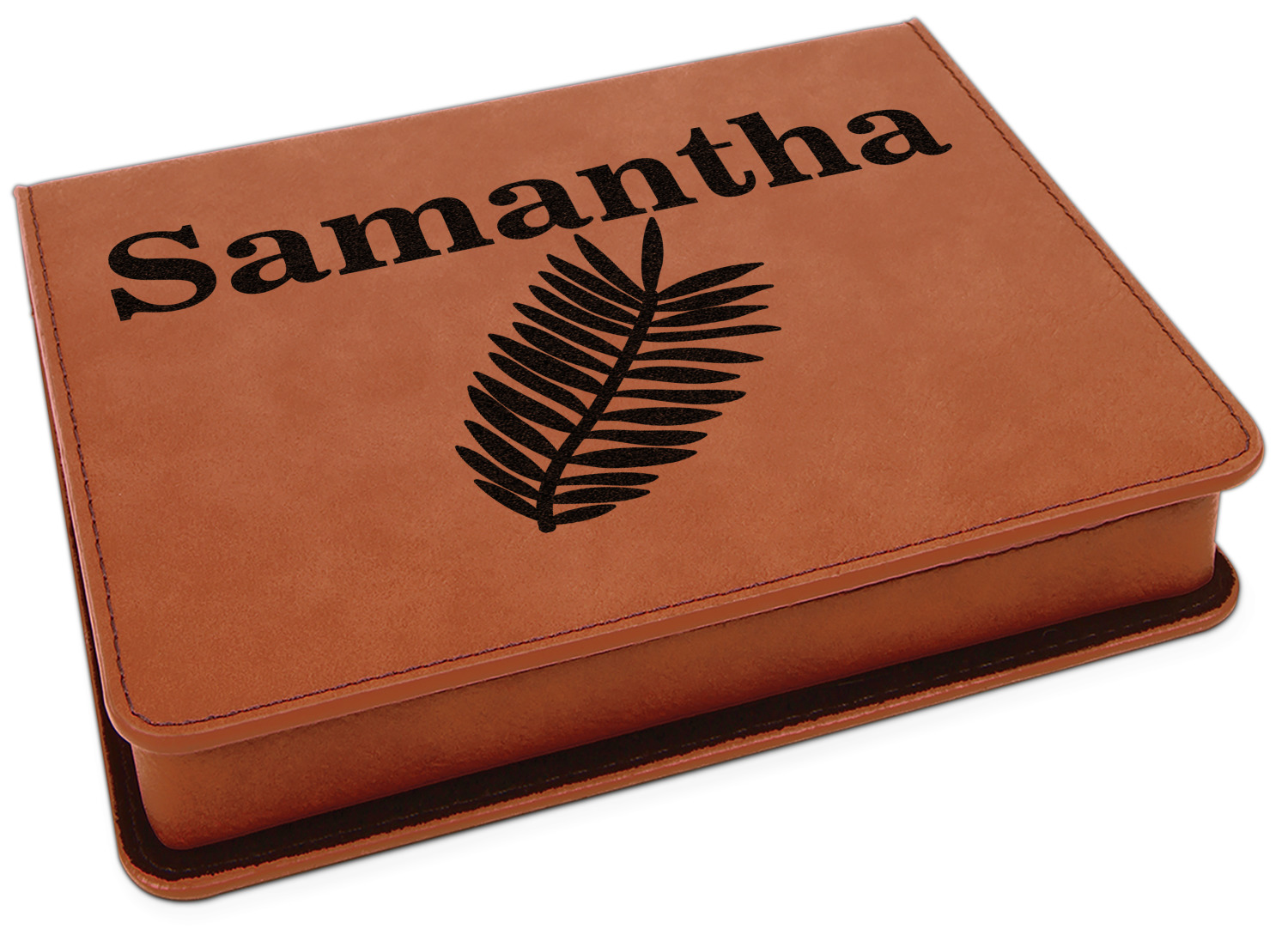 This set includes a wine stopper, pourer, drip ring, and a corkscrew! The exterior of the box is a gorgeous, cognac-brown leatherette, while the interior is covered in a black, velvety material. Four foam indentations, unique to the shape of the wine tool, are found at the bottom half of the box's interior. The tools fit snugly into each of their designated spots, and the foam material helps to protect the integrity of your tools. Each of the wine gadgets features a bamboo accent, with the location and style depending on the tool itself. We laser engrave your personalized design onto the lid of the box, which easily flips open and is secured closed by a small magnet. The wine accessories box measures at 7 by 5.5 inches in total.
