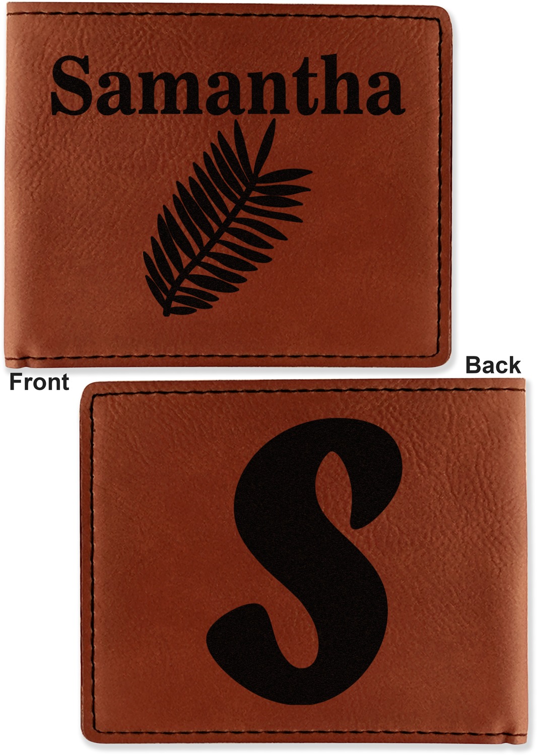 Your bifold wallet will be personalized by laser engraving, which will be a black color on the wallet. Choose a graphic, text, or monogram to personalize your wallet. There are thousands of choices in our design center.