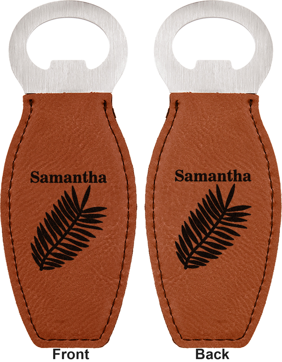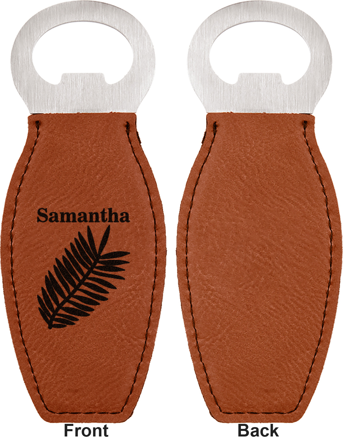 Built from stainless steel, these custom bottle openers are wrapped in a cognac-colored leatherette. Sharp, black stitching lines the edges for extra durability and a finished touch. Your personalization is laser-engraved onto the surface of this leatherette, leaving behind a crisp, black coloration. At 4.6 by 1.8 inches, this beer bottle opener gives you much of leverage when trying to open a stubborn bottle. On the opposite end of the opener, you'll find a magnet that you can use to display your new, unique bottle opener!