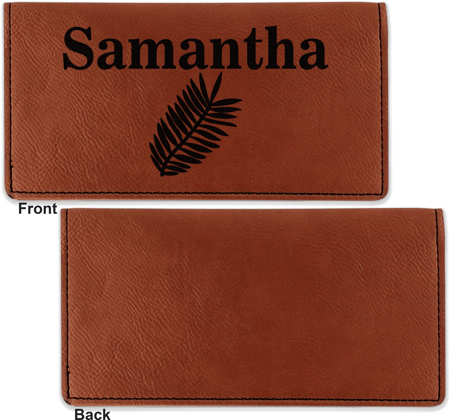 Go into our design center to start personalizing. Your checkbook cover will be laser engraved, making the graphic or text a black color. Choose a fun saying, monogram, or font to go on your checkbook cover. You have the opportunity to do it double or single sided.