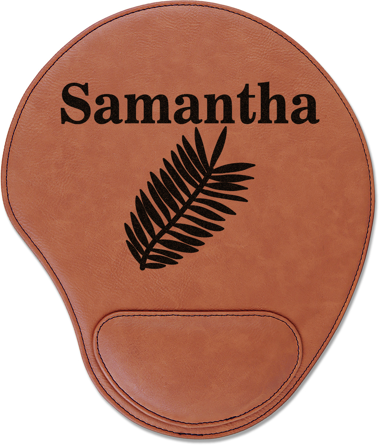 In a rounded shape, this mouse pad is made of a luxurious, cognac-colored leatherette. The nature of this material allows your mouse to glide smoothly across its surface. Strong stitching lines the edges to guarantee stability and strength. As added support for tired wrists, your personalized mouse pad features a supportive wrist rest at its bottom. This model measures at 10.25" x 9", while its wrist pad is approximately 5" x 2.75", with a thickness of 0.75". Your personalized design is laser engraved into the front face of this mouse pad.