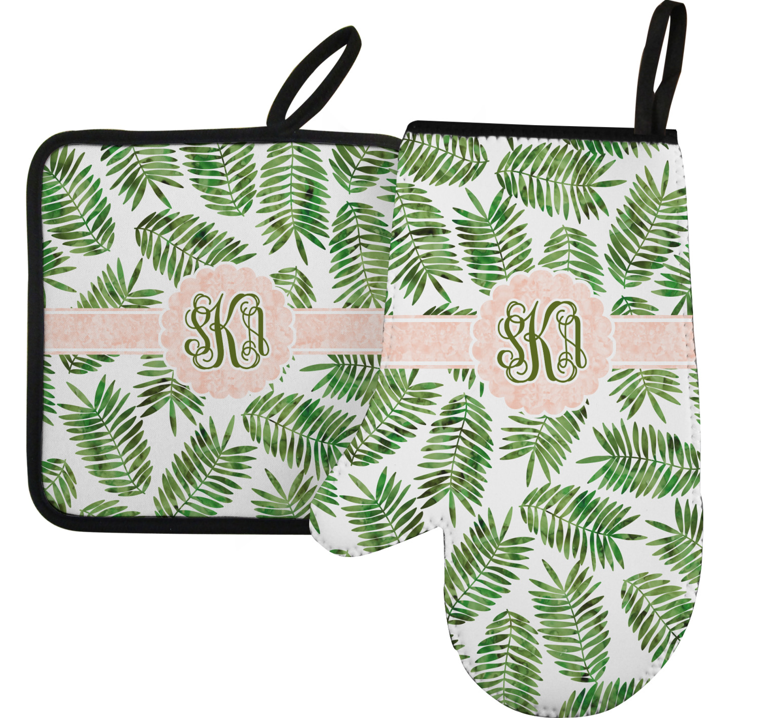 The coordinating design has the same leafy background and peach ribbon. In place of the framed monogram, there is a large initial and name filled with a dark green watercolor texture.