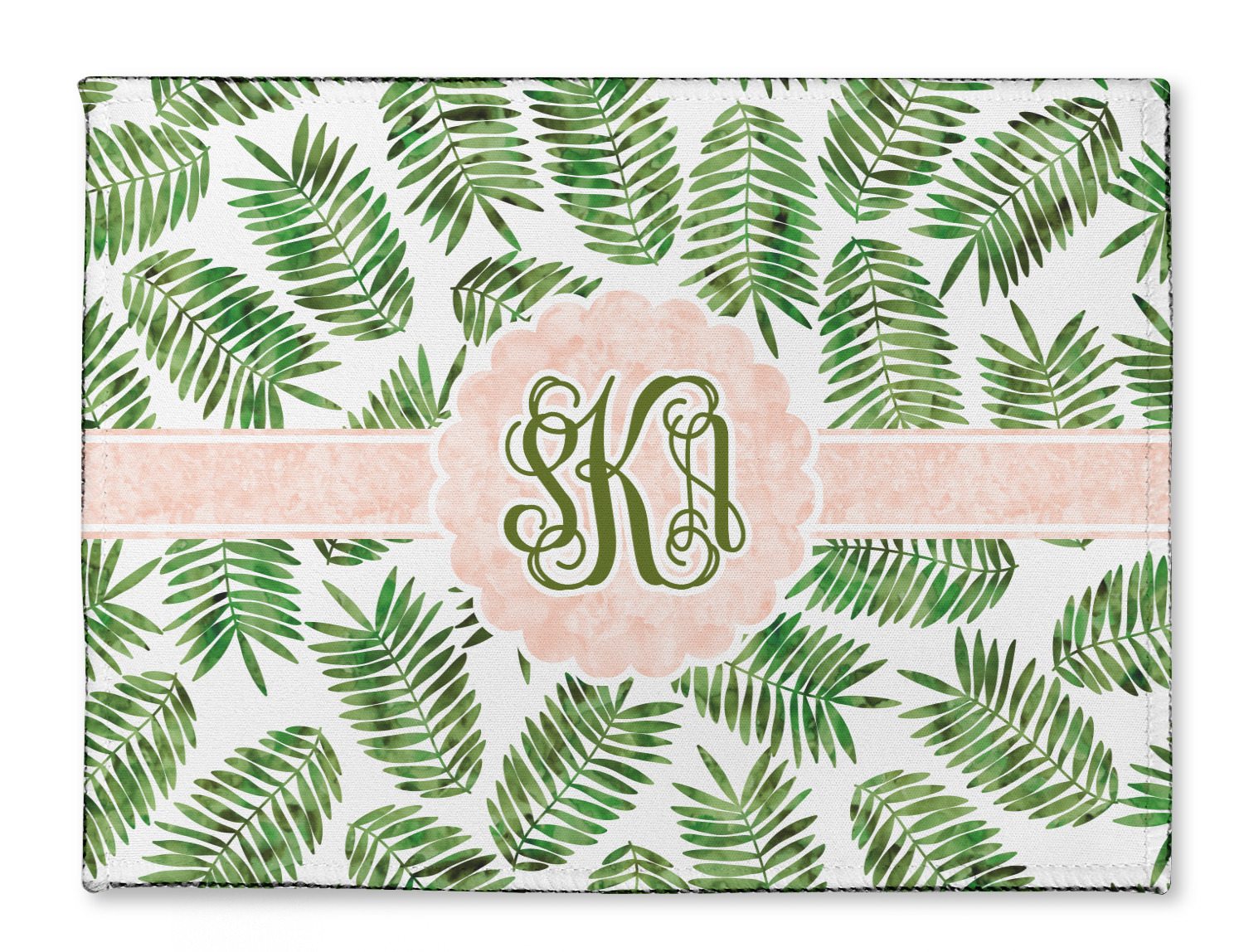 The background of the main design is filled with thin tropical leaves scattered about. The leaves are filled with a dark green watercolor texture. The ribbon and scalloped frame are filled with a light peach watercolor texture. The monogram in the middle gives an extra feminine touch to this design.