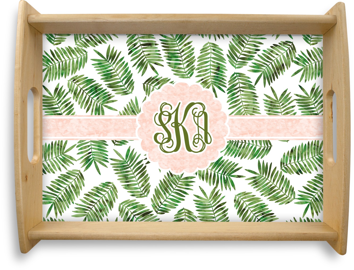 This serving tray with handles features square edges and two rounded sides, creating a very modern look. Each side is fabricated from a beautifully cut, natural wood. The bottom of the interior of the tray displays your customized design in bright, vibrant color. The tray is sold in both a black color and a natural wood look. Each variation of the wood serving tray has two sizes: Small, which is 14" x 10" x 2.25", and Large, which is 19.5" x 13.5" x 2.75".