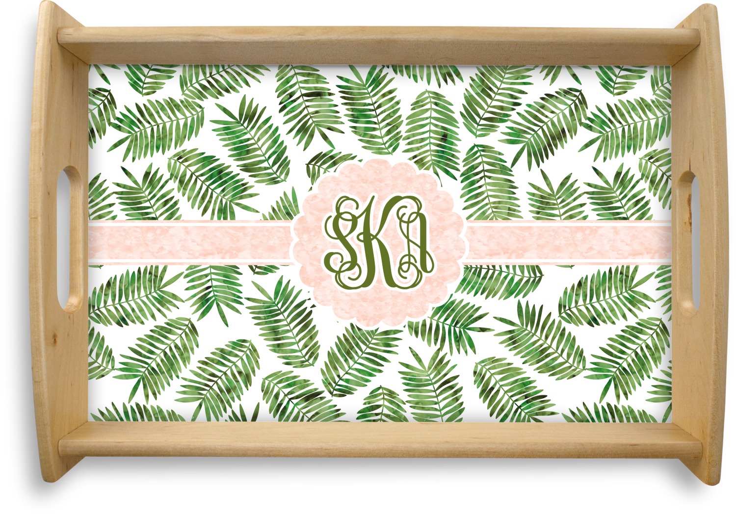 This serving tray with handles features square edges and two rounded sides, creating a very modern look. Each side is fabricated from a beautifully cut, natural wood. The bottom of the interior of the tray displays your customized design in bright, vibrant color. The tray is sold in both a black color and a natural wood look. Each variation of the wood serving tray has two sizes: Small, which is 14" x 10" x 2.25", and Large, which is 19.5" x 13.5" x 2.75".